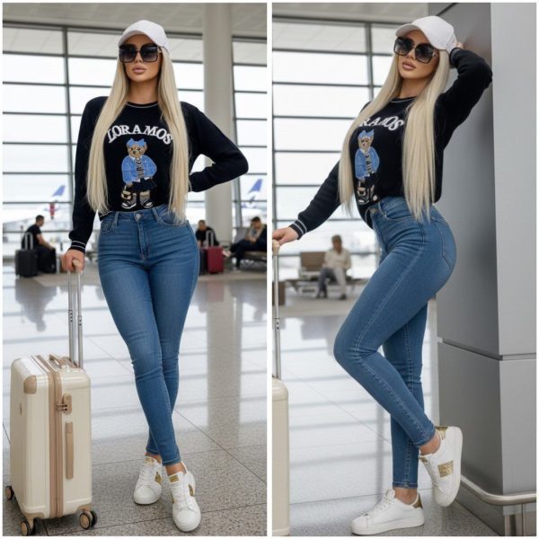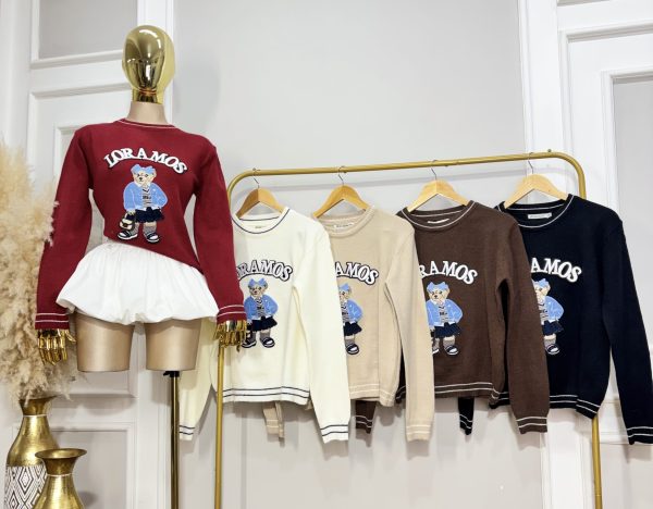 Suéter femenino estilo casual, confeccionado en tejido acogedor con stretch. Presenta diseño frontal de osito y LORAMOS en relieve. Detalle ribeteado en cuello, puños y dobladillo en contraste, que le dan un toque moderno y juvenil. Ideal para combinar en un look relajado y con estilo.