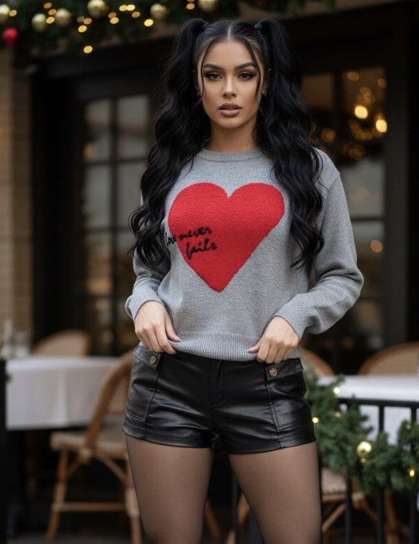 Suéter romántico y moderno. Diseño con corazón rojo tejido al frente y lettering “love never fails” en detalle bordado que aporta un toque delicado y femenino. Confeccionado en punto suave, súper stretch, cuello redondo clásico, mangas largas y terminaciones acanaladas que brindan un ajuste cómodo y favorecedor.