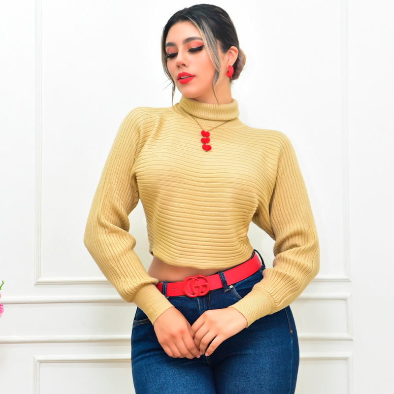 Suéter corto olgado de cuello alto con texturizado de rayas horizontales. Cuello alto. Suave al tacto. Composición algodón. Stretch abarca de 5 a 13