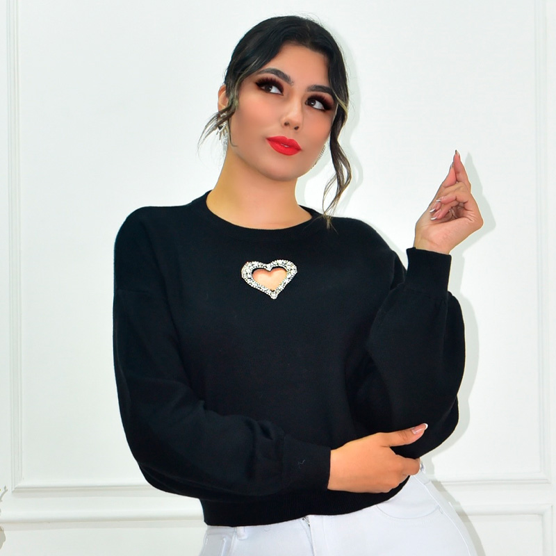 Suéter pullover de manga larga. Cuello redondo con detalle de cut out de corazón decorado con pedrería. Super suave.