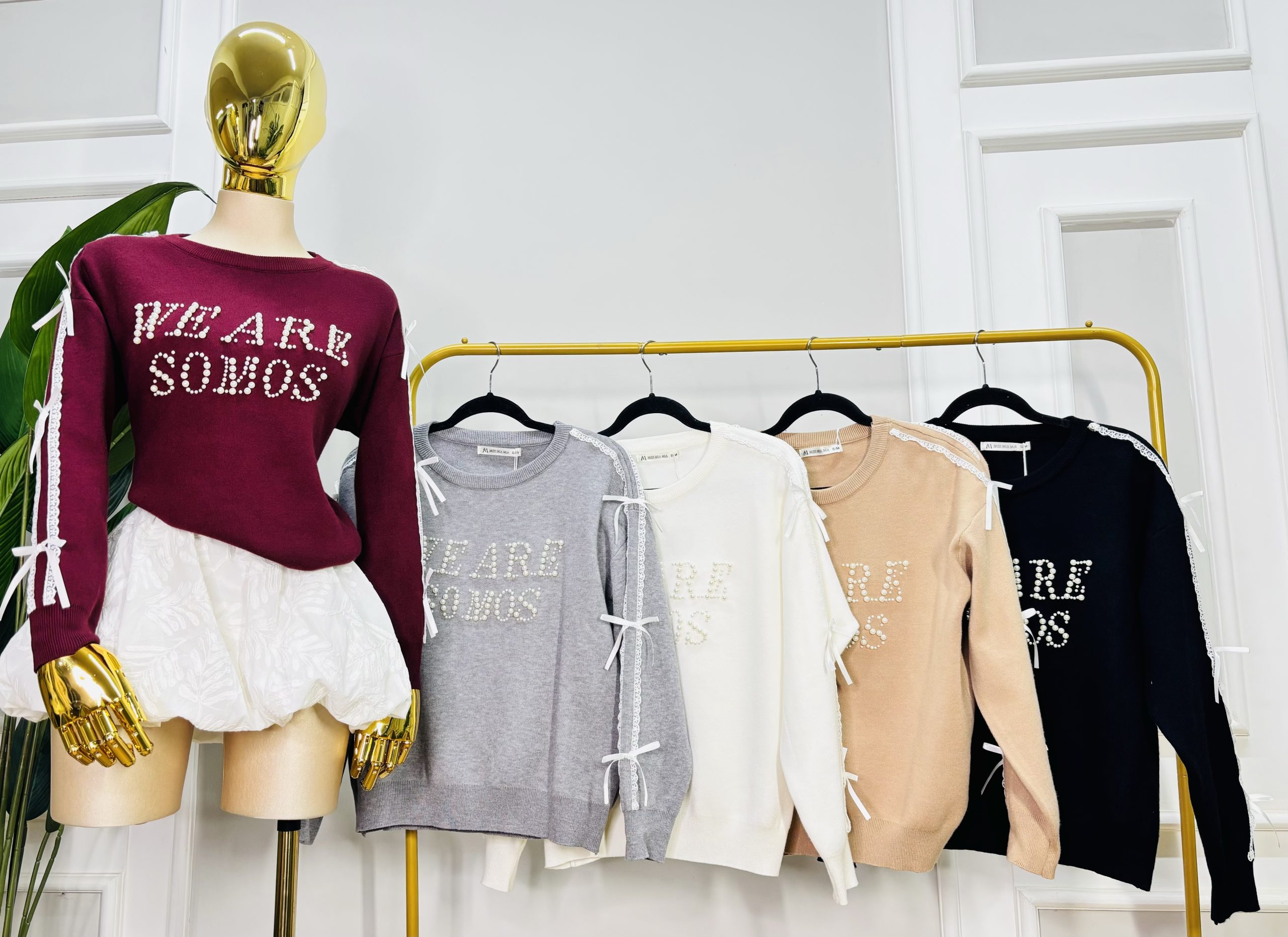 Suéter suave y cómodo con un diseño femenino y moderno. Texto frontal “We are – Somos” con aplicación de perlas decorativas. Mangas con encaje lateral y moños de listón. Corte recto y cuello redondo. Con stretch. Ideal para un look casual con un toque chic y elegante 🎀✨