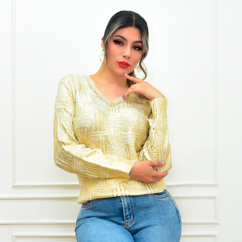 Suéter tejido de punto, detalles estampados metálicos que dan efecto texturizado en relieve. Cuello en V. abarca de 5 a 13