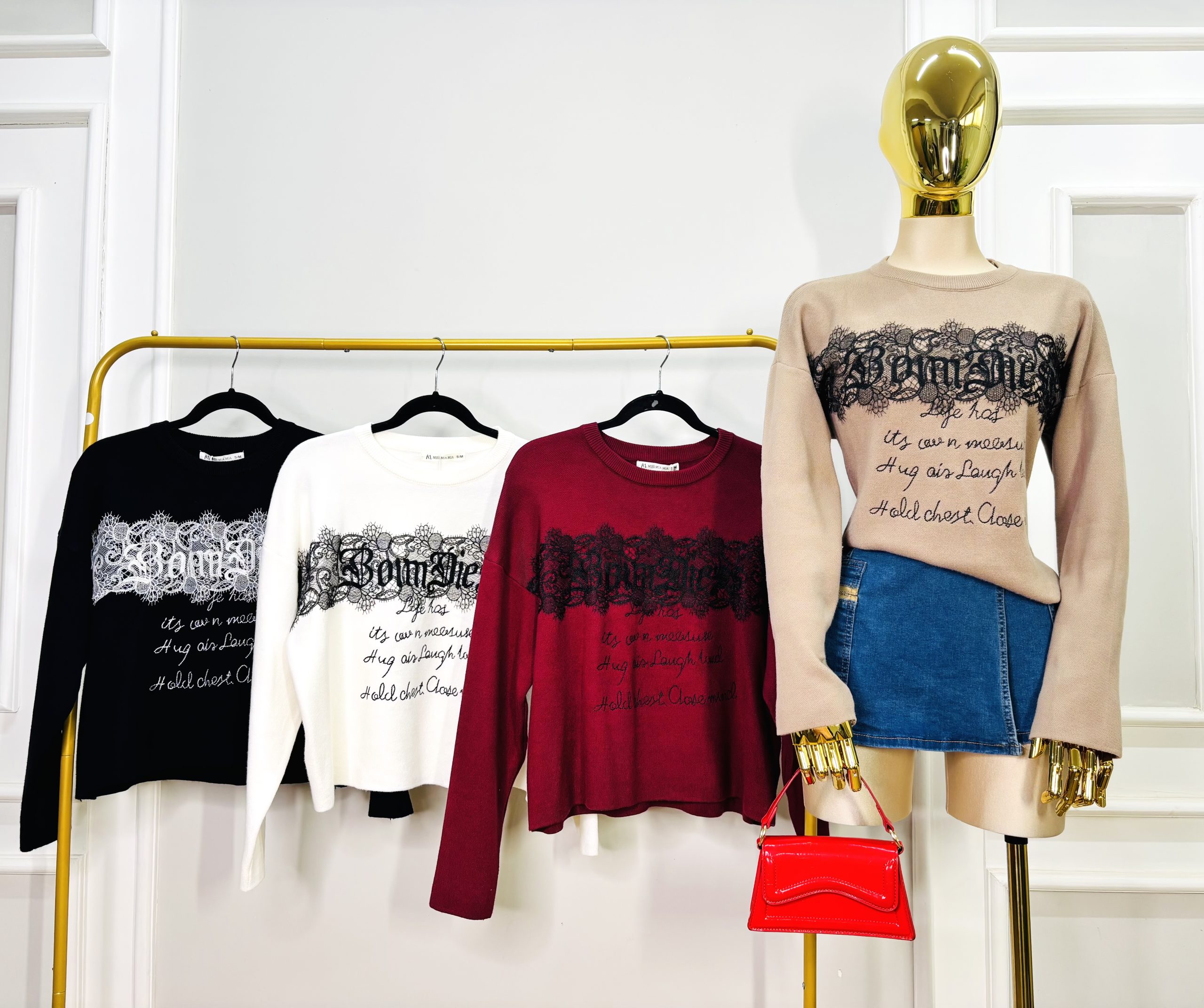 Sueter confeccionado en viscosa suave y cómoda con stretch. Diseño de franja en encaje y letras bordadas al frente que aportan un toque femenino y chic. Corte recto con cuello redondo, fácil de combinar con jeans o faldas 🧸