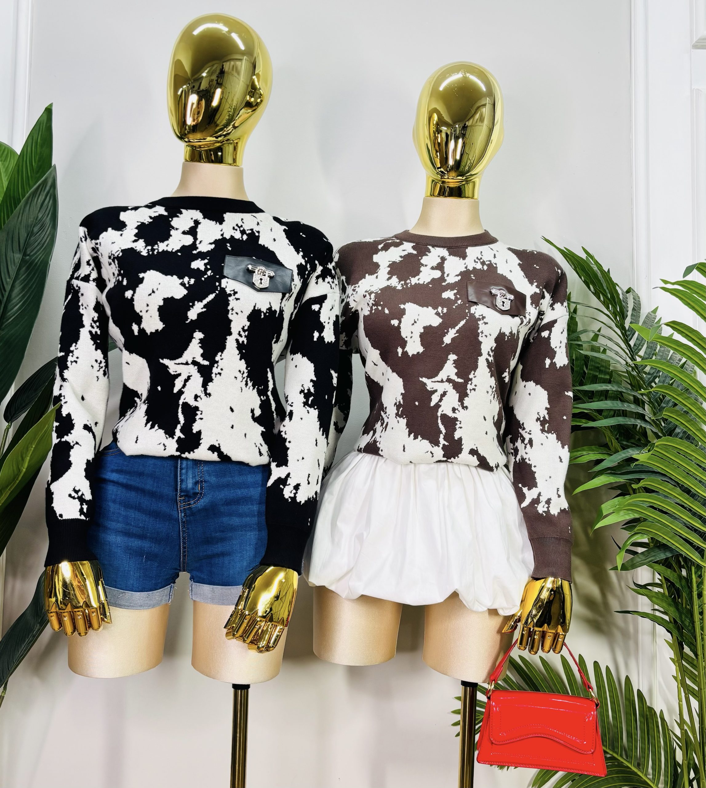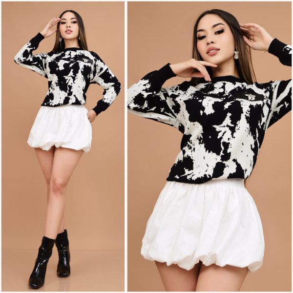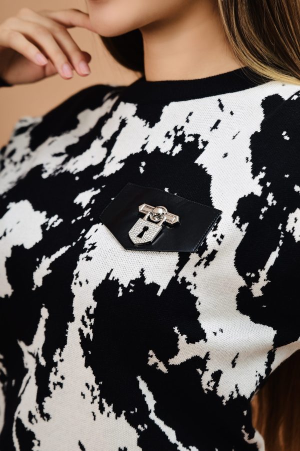 Suéter de manga larga con diseño estampado tipo manchas en contraste. Corte recto y cómodo. Puños y cuello redondeado en acabado acanalado. Confecconado en Tejido ligero, suave, stretch y abrigador. Detalle de Bolsillo aparente con candado. Perfecto para un look casual y moderno con un toque western.