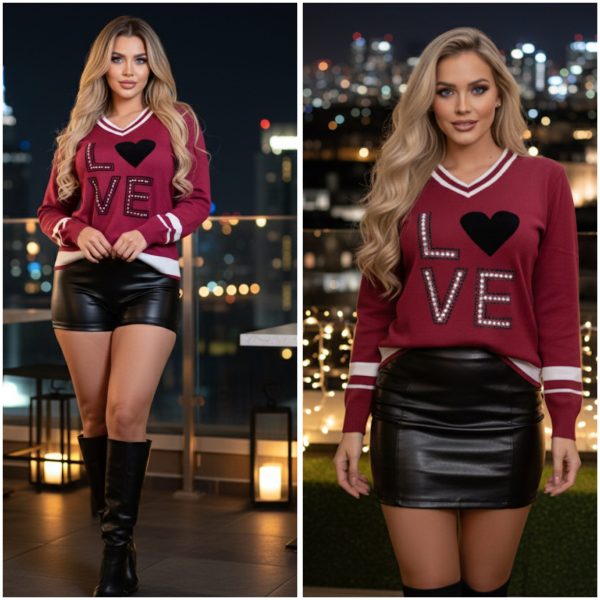 Suéter de estilo casual con diseño moderno. Confeccionado en tejido suave y stretch, Cuello en “V”. Diseño con estampado frontal LOVE y detalles de perlas y pedrería. 💖. Prenda versátil ideal para combinar con jeans o faldas.