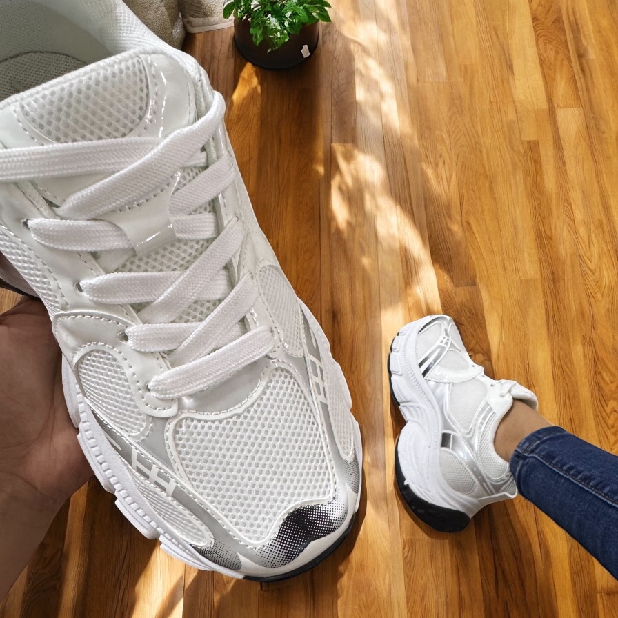 Tenis estilo chunky (voluminoso) con detalles en plateado y negro. Diseño moderno con suela gruesa que proporciona altura y amortiguación, ideal para uso casual o deportivo. Malla transpirable. Diseño de líneas curvas y detalles gráficos que le dan un toque dinámico.