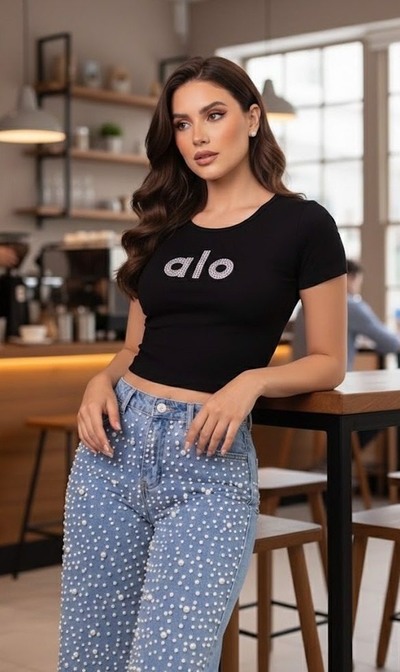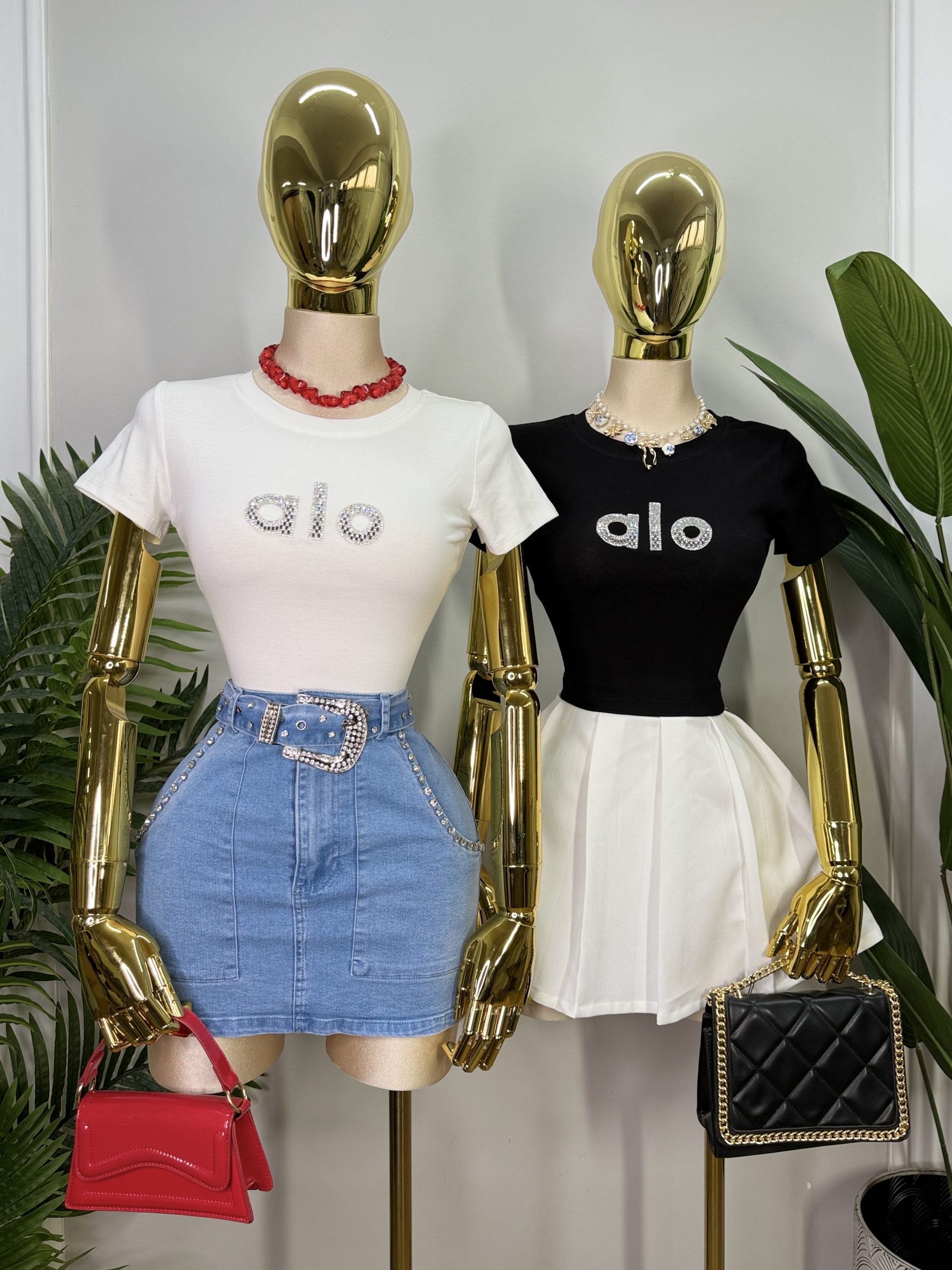 Top de manga corta, confeccionado en tela de algodón. Letras decoradas con apliques brillantes tipo cristal. Stretch. Súper combinable y cómodo.