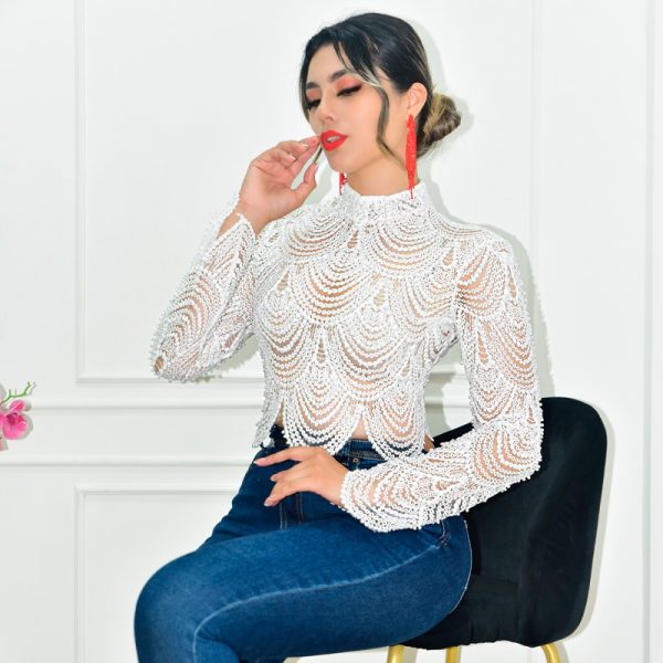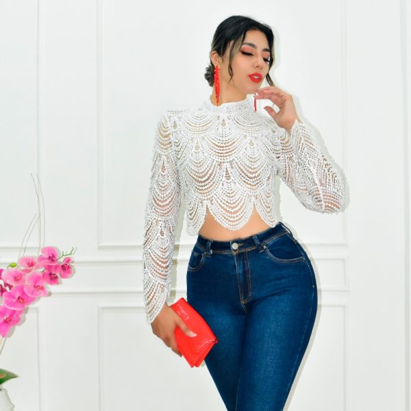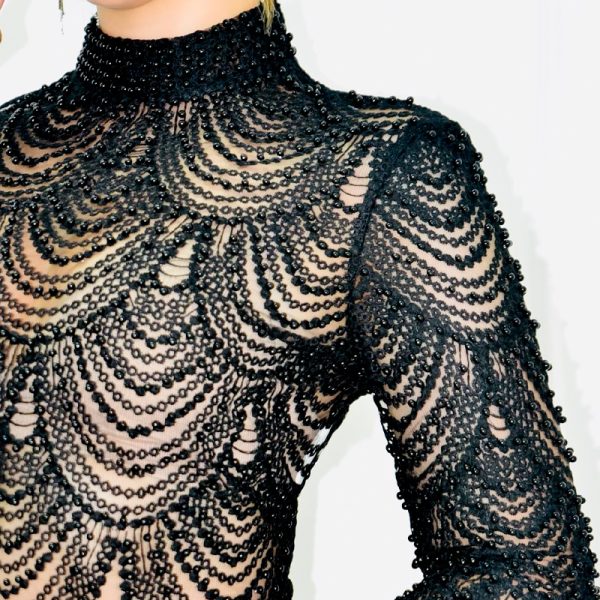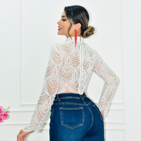 Top de encaje y perlas de fantasía en mismo tono. Cuello estilo militar y mangas largas. Cremallera metálica en espalda. Diseño transparente que da aspecto de colgantes en las perlas. Tela rígida.