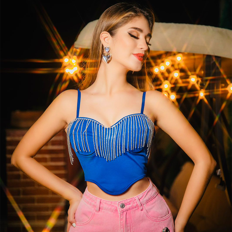 Top con cadenitas brillantes en busto. Tirantes ajustables. Copas.