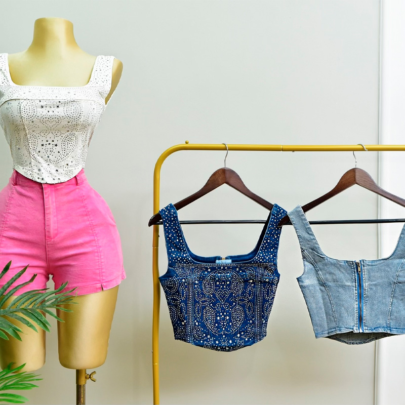 Top de mezclilla, sisado de mezclilla, incrustaciones de pedrería en todo el frente. Cierre metálico en espalda. Stretch.
