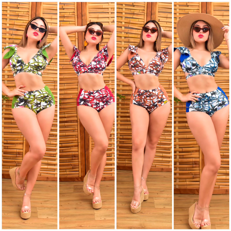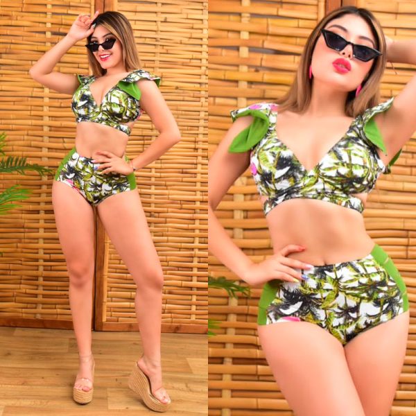 Traje de baño estilizador. Tira ancha cruzada en top mangas tipo mariposa. Panti con elásticos anchos laterales. Increíble estampado.