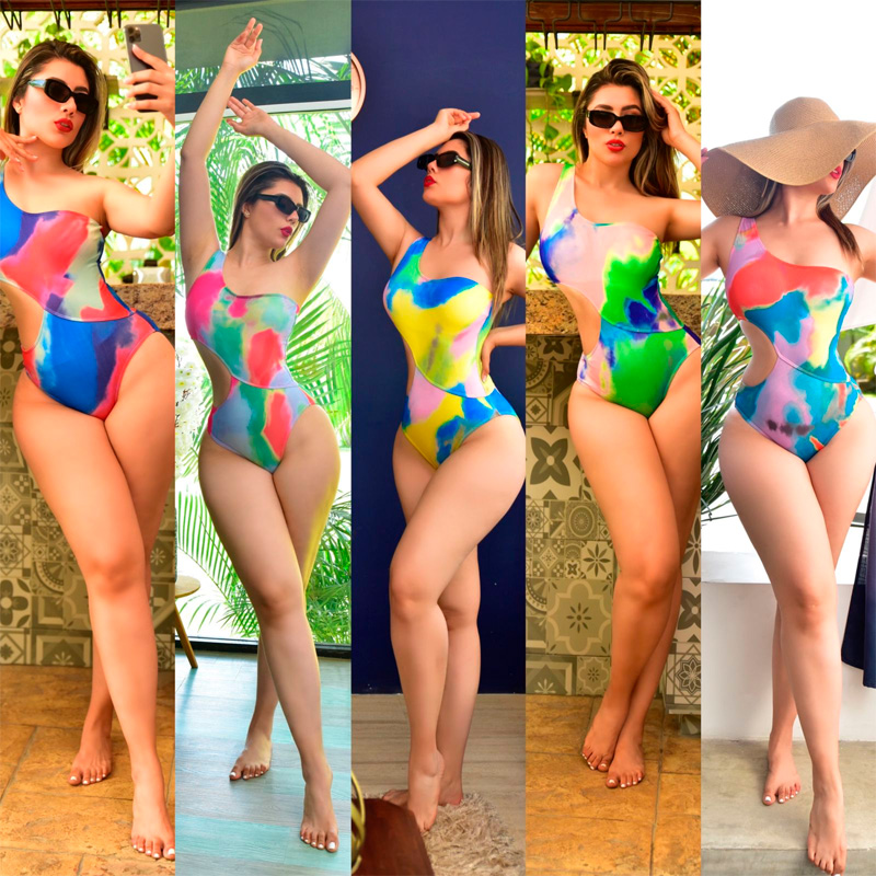 Traje de baño corte one shoulder. Llamativo estampado Tie Dye. Con abertura que se complementa con detalle cruzado.