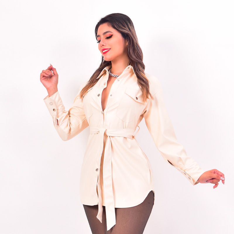Túnica de vinipiel con cinta para ajustar. Bolsillos frontales. Cierre con botones de remache a presión. Cuello camisero. Forro de algodón.
