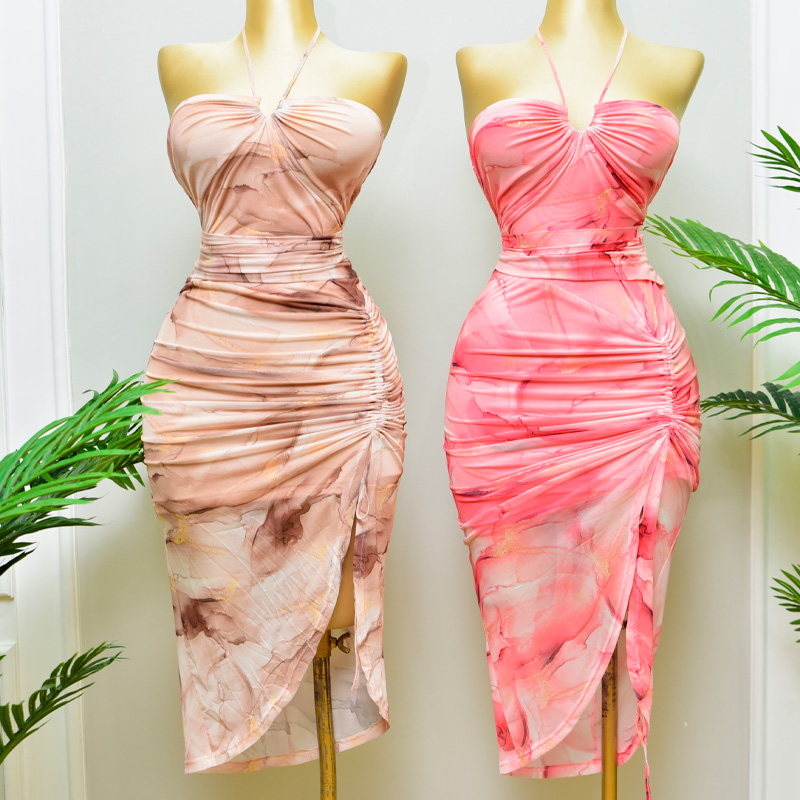 Precioso vestido halter, tonos muy tenues con detalles en dorado; jareta en pierna para ajustar a la altura que desees. Delicada cinta en escote para ajustar. Corrugado en espalda. Tela mesh y forro interior.