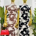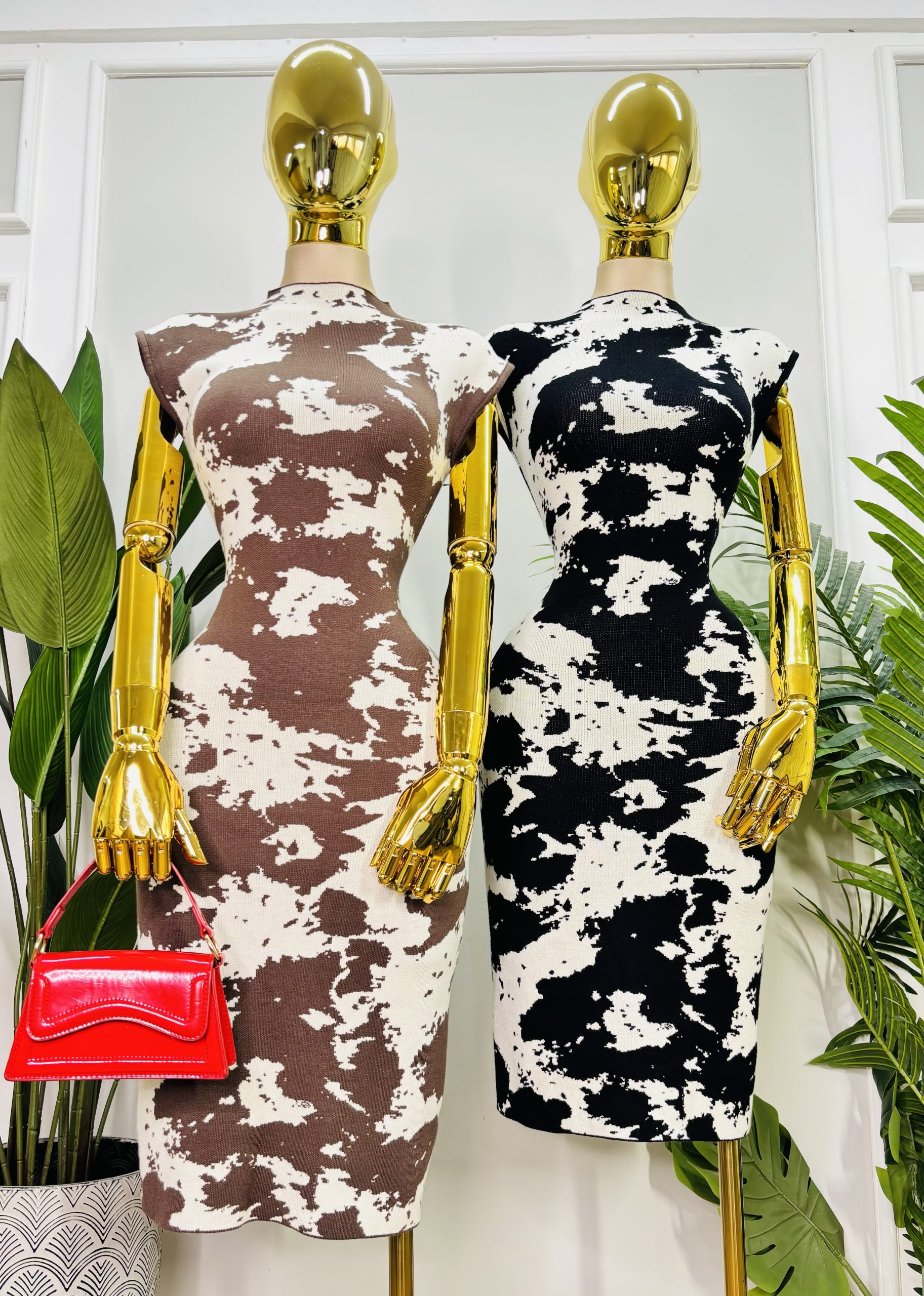 Vestido de corte ajustado estilo bodycon, confeccionado en viscosa con stretch que realza la silueta. Estampado abstracto tipo animal print vaquero. Diseño sin mangas y cuello alto aportan un toque sofisticado y moderno. Perfecto para destacar con estilo y un giro chic. 💗
