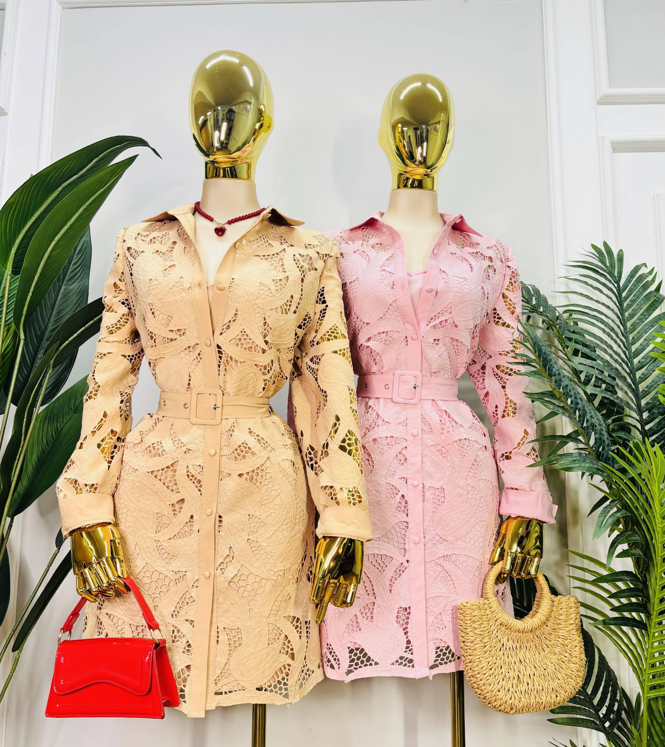 Vestido camisero confeccionado en encaje bordado con diseño calado. Cuello camisero clásico. Botonadura completa al frente. Manga larga con puño. Incluye cinturón liso ajustable a juego para realzar la figura y forro de tirantes como pieza separada, perfecto para llevar debajo del vestido con mayor comodidad. Perfecto para lucir encantadora y sofisticada. 💕