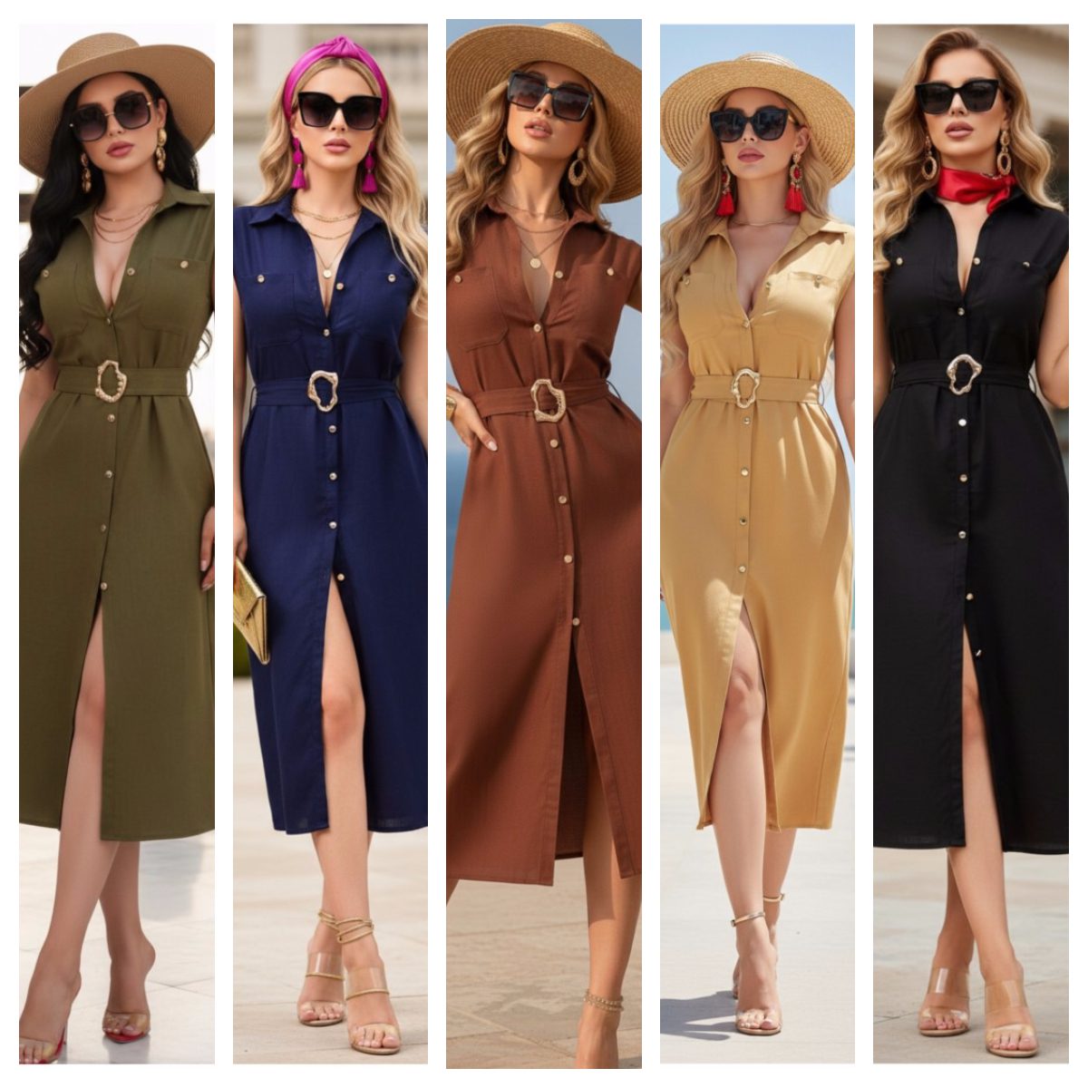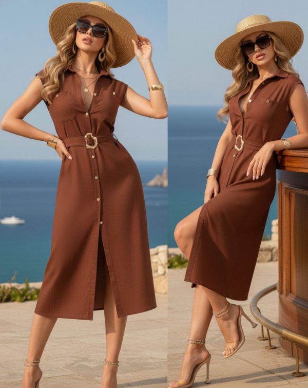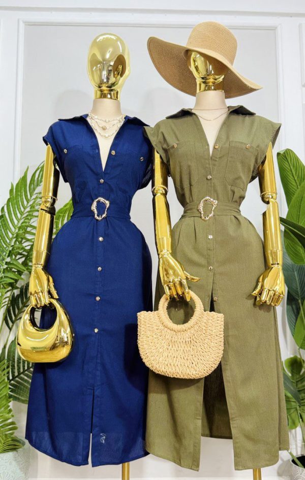 Vestido de corte midi confeccionado en tela ligera y fresca ideal para climas cálidos. Diseño camisero con botones frontales funcionales, cuello clásico y mangas cortas con acabado limpio. Incluye cinturón del mismo tono con hebilla decorativa que define la cintura y estiliza la silueta. Una pieza versátil y elegante.