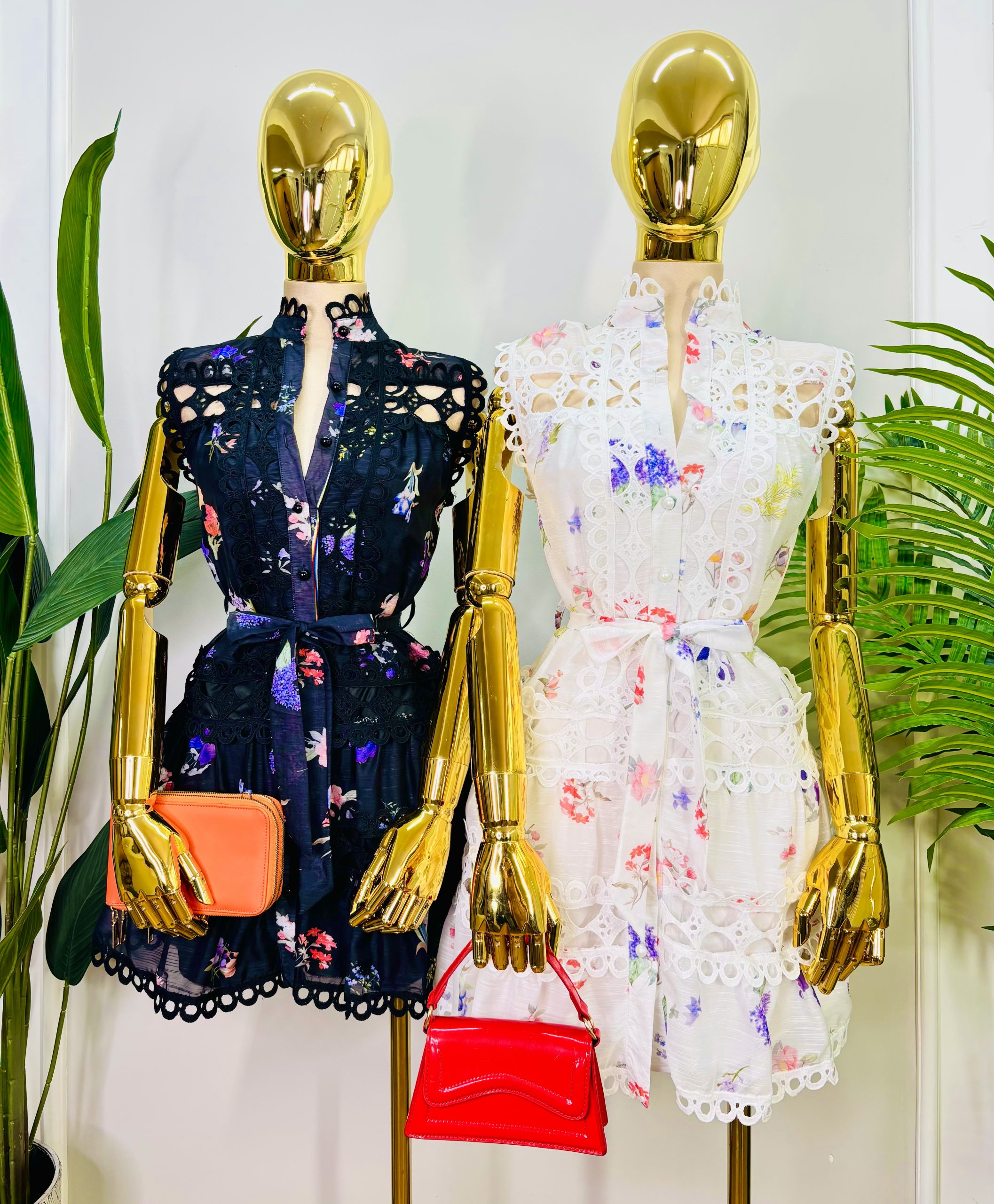 Vestido sin mangas con encaje. Confeccionado en tela ligera estampada con flores y sobrepuesta con delicado encaje calado en franjas horizontales. Presenta cuello alto con terminación en ondas y botonadura frontal. Incluye forro y cinta a juego para ajuste a la cintura. ideal para un look fresco y elegante. 💕