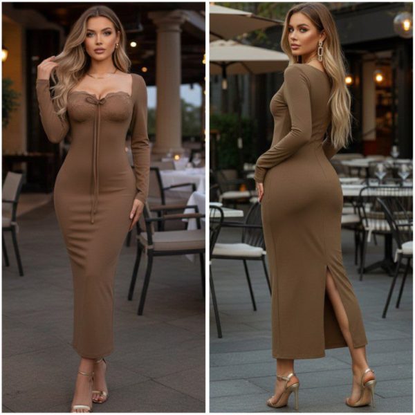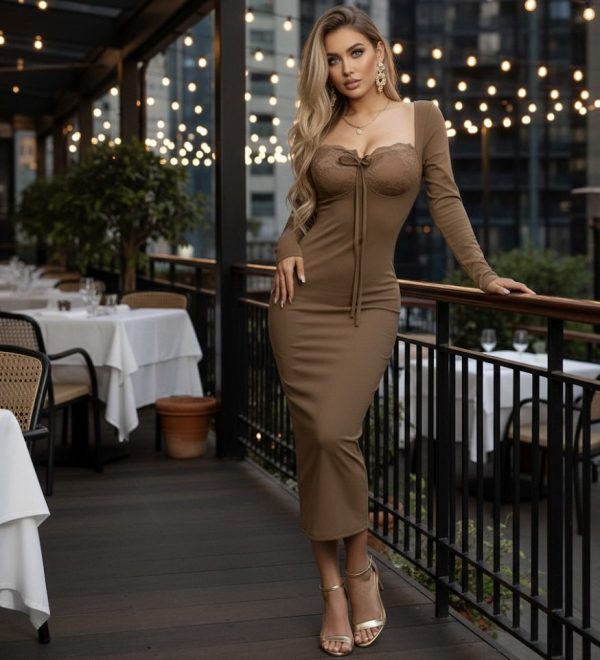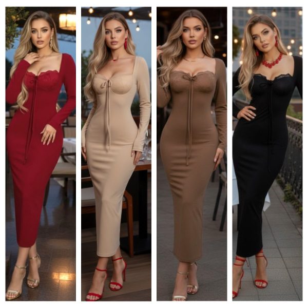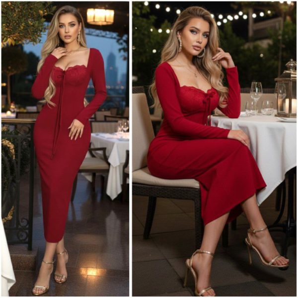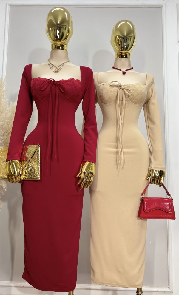 Vestido de estilo ceñido y manga larga, confeccionado en un tejido elástico que se adapta a la silueta. Escote con copas preformadas adornadas con encaje floral y cordón decorativo en el centro del escote. Cierre invisible en la espalda y ligera abertura trasera para mayor comodidad al caminar.