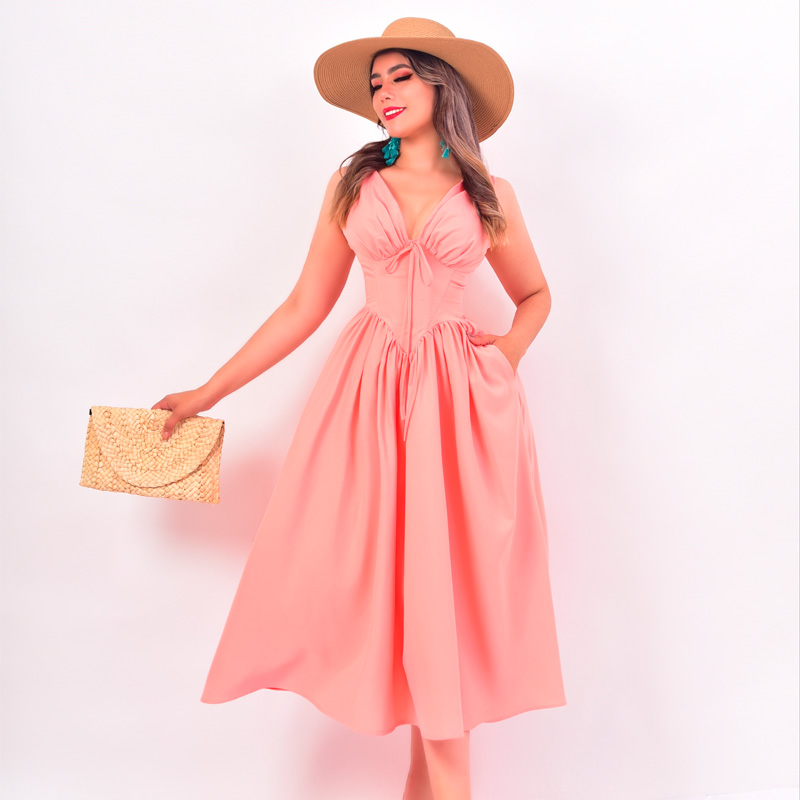Vestido largo con corset de varillas. Estiliza figura. Escote en V. Liston en busto que simula jaretas. Sin mangas. Elástico fruncido en espalda.