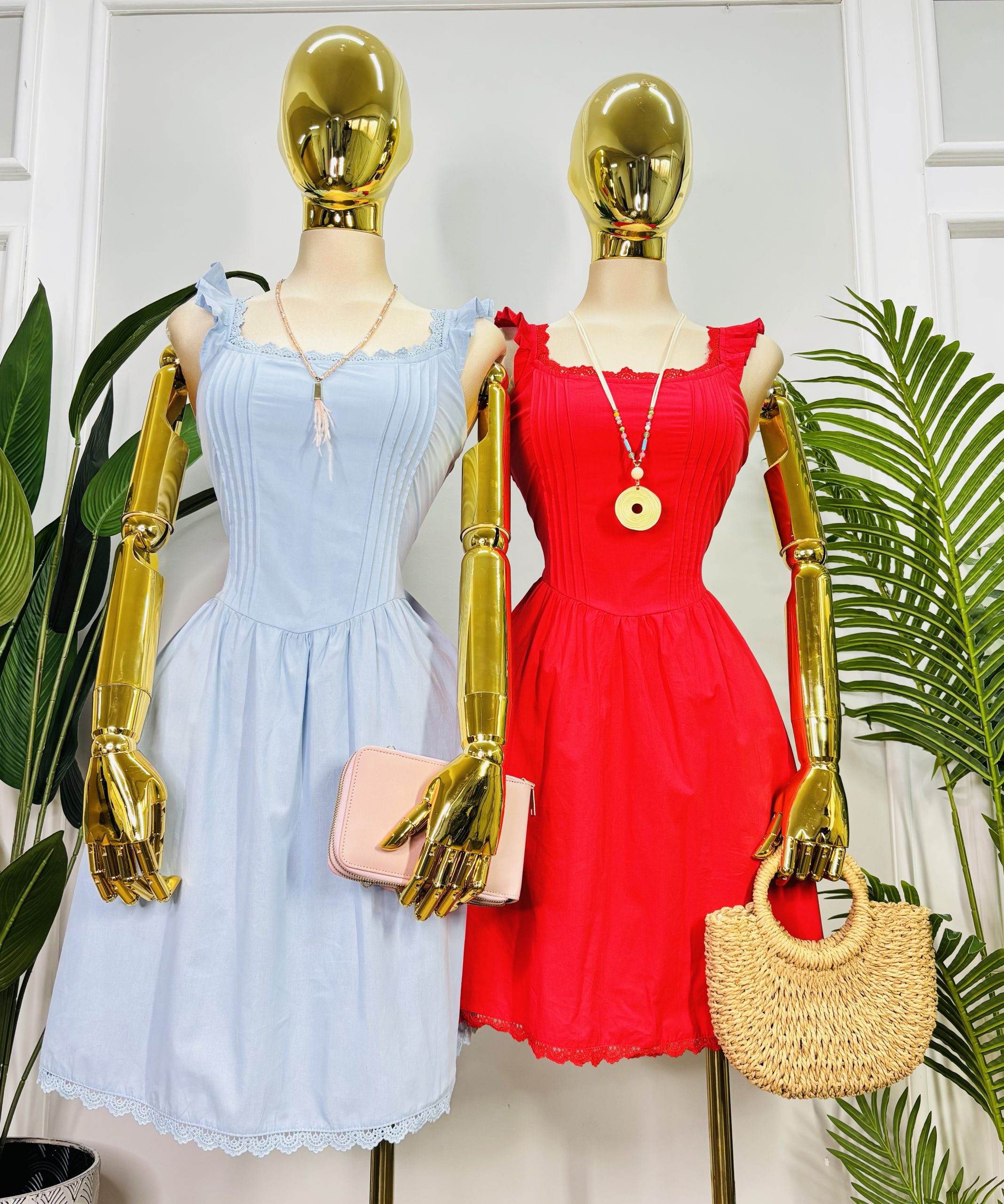 Vestido corto. 100% algodón ✨✨ ligero y fresco. Tirantes con pequeños volantes y detalle de encaje en escote y dobladillo, que aportan un toque romántico. Pinzas verticales frontales que estilizan la figura. Elástico fruncido en espalda. Ideal para un look veraniego, coqueto y femenino. 🌸✨