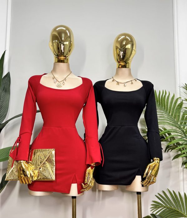 Vestido corto de manga larga acampanada tipo “flare sleeves”. Detalle decorativo de lazos para amarrar en moño, que aportan un toque femenino. 💓