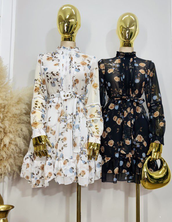 Vestido corto de estilo femenino y versátil, confeccionado en tela ligera con estampado floral. Manga larga y cuello alto con ligero fruncido. Elástico en cintura. Incluye cinta del mismo tejido para ajustar. Falda con ligero vuelo.