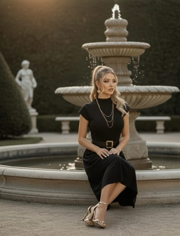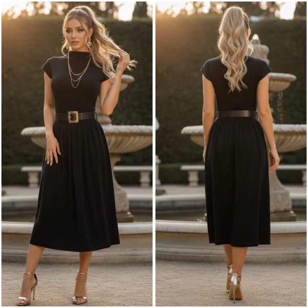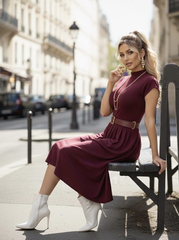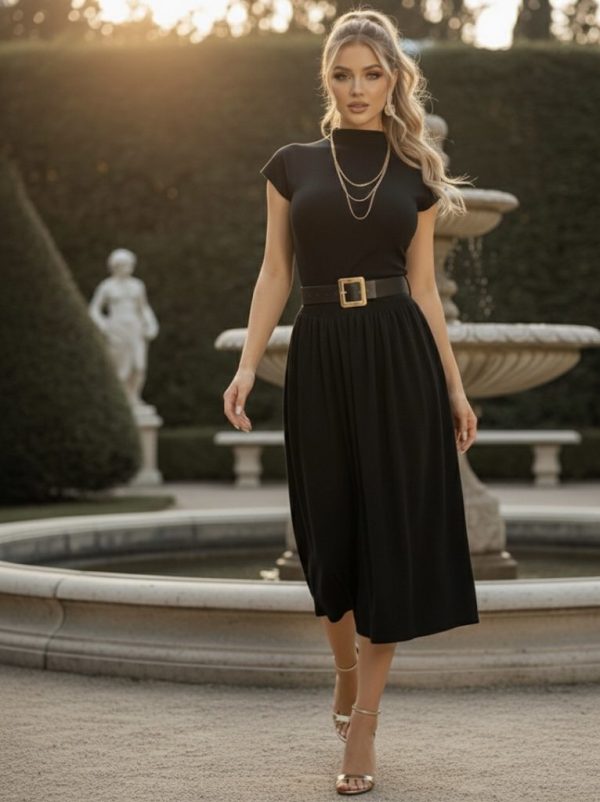 Vestido de punto muy sofisticado. Diseño midi con la parte superior ajustada de cuello alto y hombros ligeramente estructurados. Incluye cinturón ancho con hebilla dorada. Falda con ligero vuelo, creando una silueta femenina y clásica. Súper stretch.