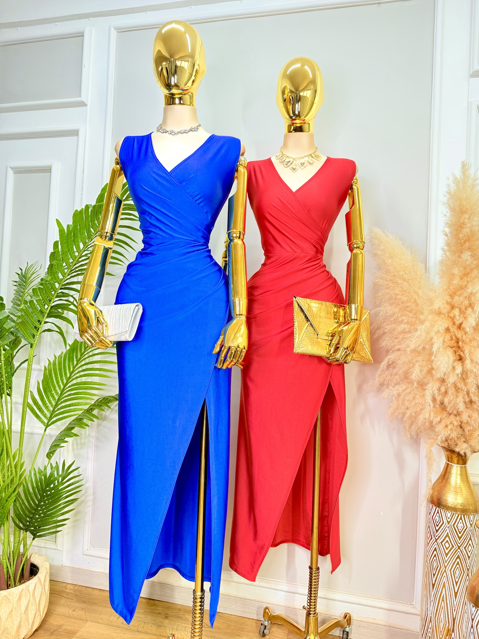 Vestido largo satinado con caída fluida y brillo sutil. Escote cruzado que estiliza el torso y realza el busto. Diseño entallado favorecedor. Abertura lateral que aporta un toque sensual y moderno. Efecto drapeado en cintura. Ideal para eventos formales y fiestas de noche para un look impactante y glamuroso.
