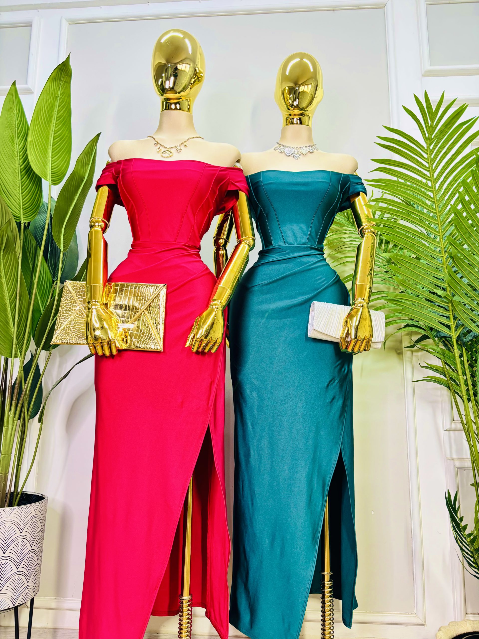 Vestido largo satinado con caída fluida y brillo sutil. Escote off shoulder. Costuras verticales que estilizan el torso. Drapeado lateral añade un detalle elegante y favorecedor. Abertura lateral elegante. Perfecto para cenas, cocteles o cualquier ocasión especial donde quieras brillar con clase y seguridad. 💃