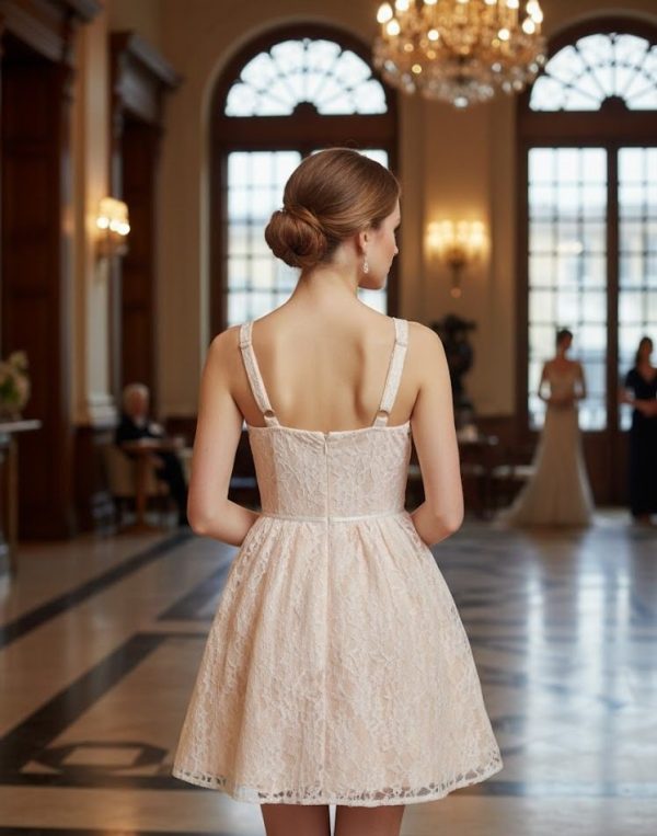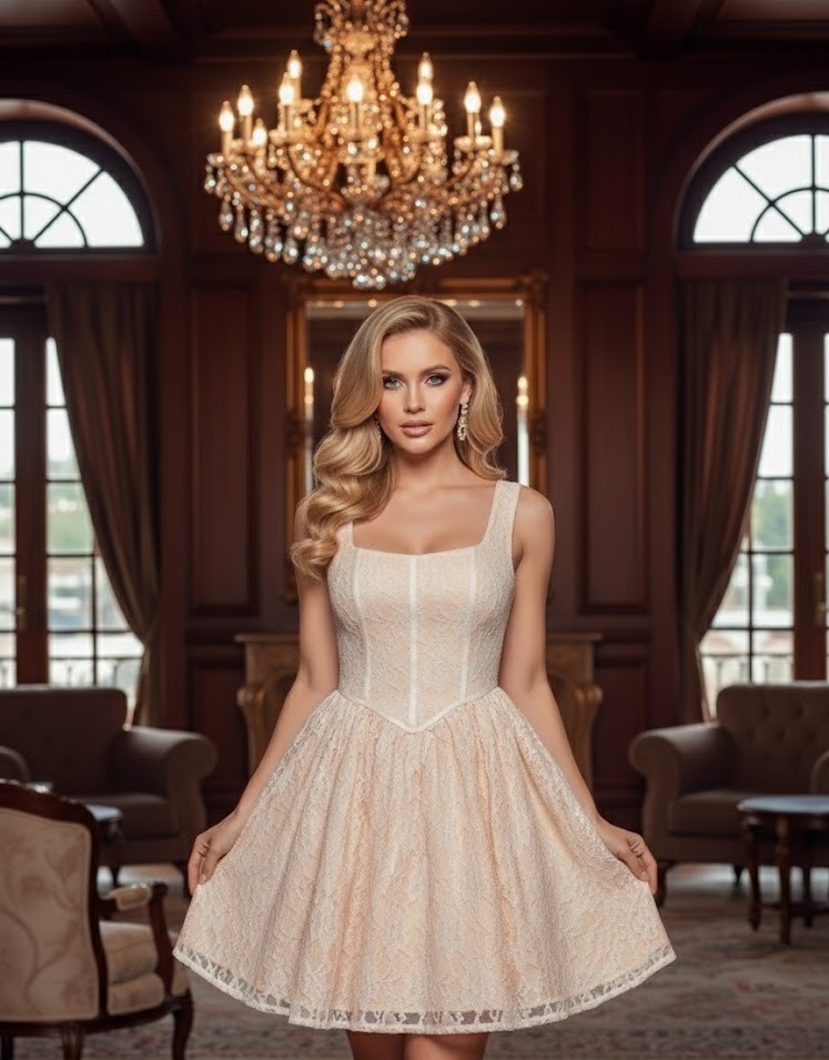 Vestido de encaje estilo princesa. Ribetes en mismo tono que aparentan corset. Forro grueso satinado. Tirantes anchos ajustables. Elástico en espalda, cierre invisible.