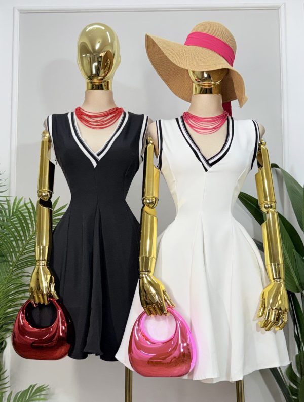 Vestido coto sin mangas con escote V ribeteado en contraste que le da un toque Sporty Chic moderno. Confeccionado en tela gruesa y fresca. Diseño entallado en cintura y pinzas que dan vuelo a la parte inferior del vestido y que estiliza la silueta. Cierre lateral. Bolsillos laterales funcionales.