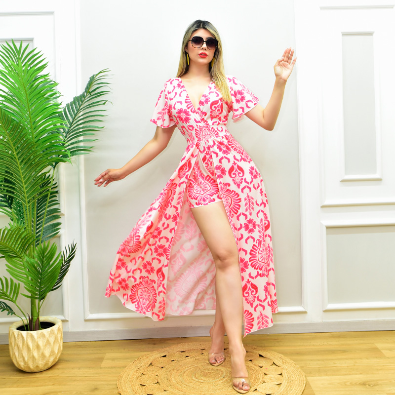 Romper dress con estampado floral. Escote cruzado en V. Elástico en cintura. Tela súper fresca.