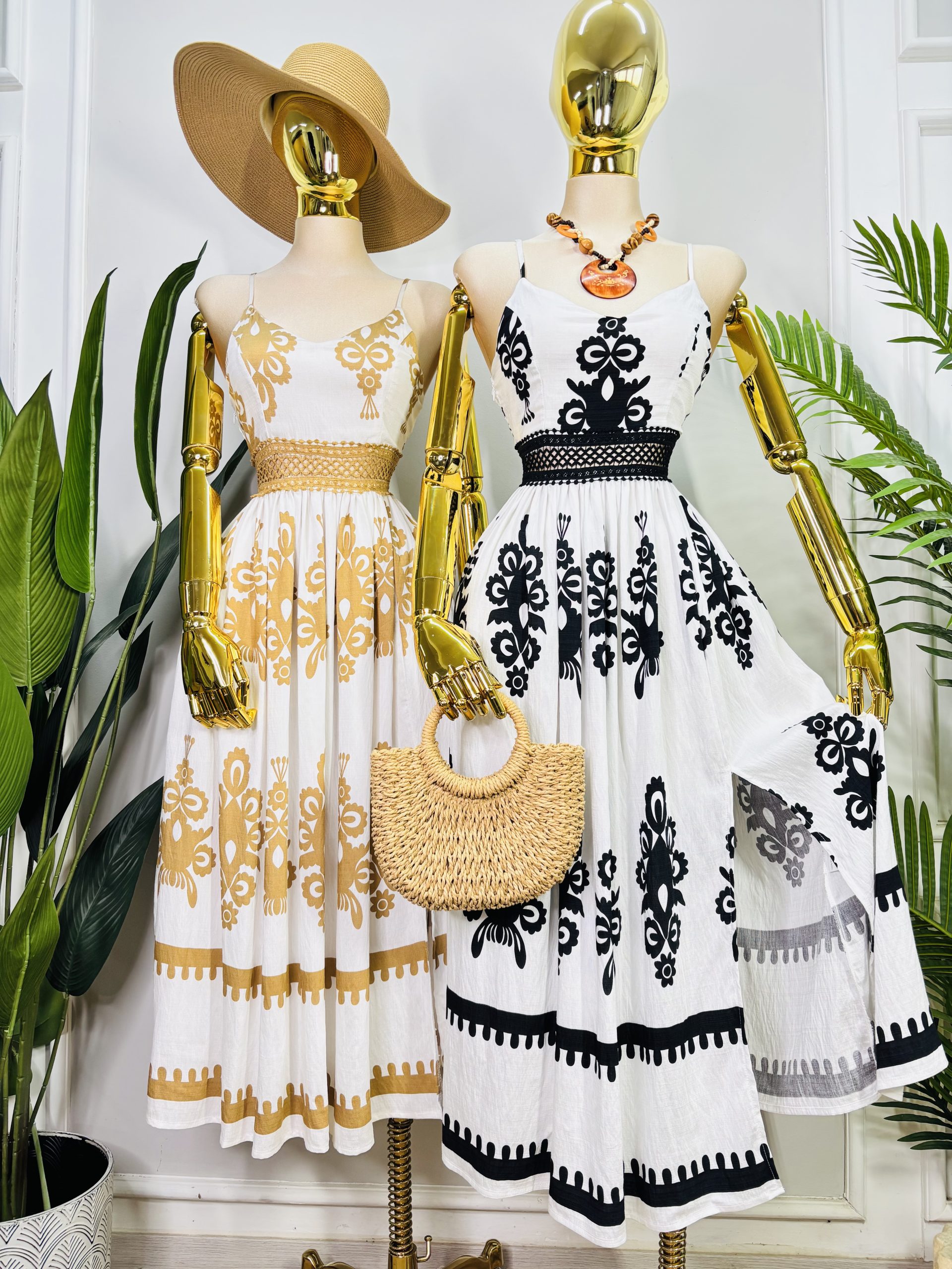 Vestido con estampado que aporta contraste y elegancia. Diseño de tirantes delgados ajustables y escote en V, ideal para estilizar el cuello y hombros. Detalle de tira bordada en la cintura que realza la silueta de forma delicada. Falda amplia y fluida con abertura lateral. Elástico fruncido en espalda. Cierre invisible y bolsillos laterales. Perfeto para este verano.