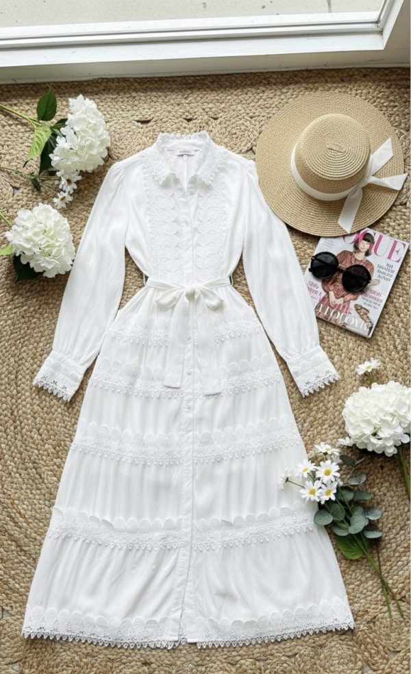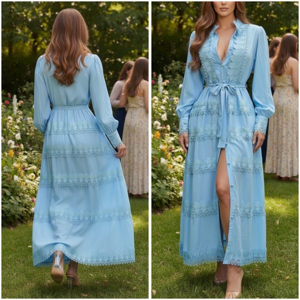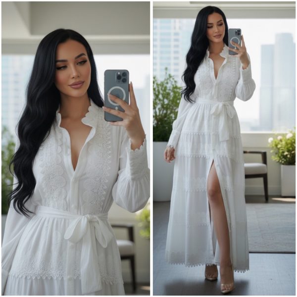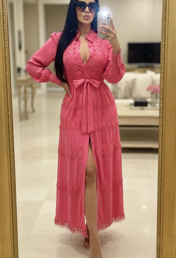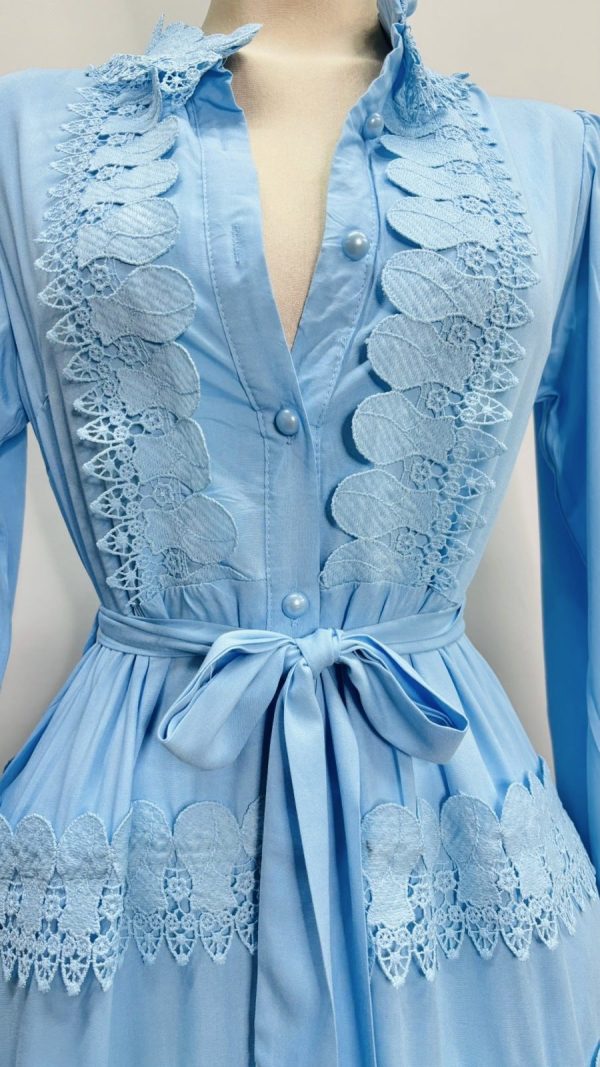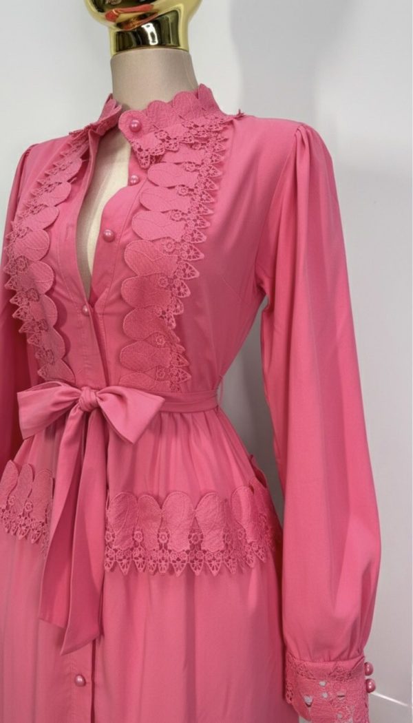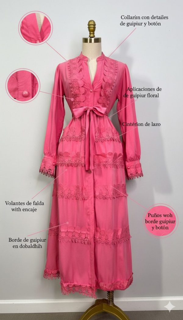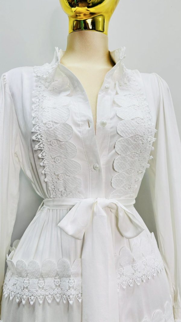 Vestido midi de manga larga confeccionado en algodón ✨. Con detalles de encaje en mangas, cintura y falda que le dan un toque femenino y elegante. Diseño con botones frontales. Incluye forro y cinta para ajustar en cintura y resaltar la figura. Perfecto para ocasiones especiales o un look romántico y sofisticado. 💖