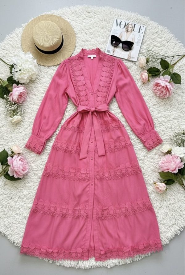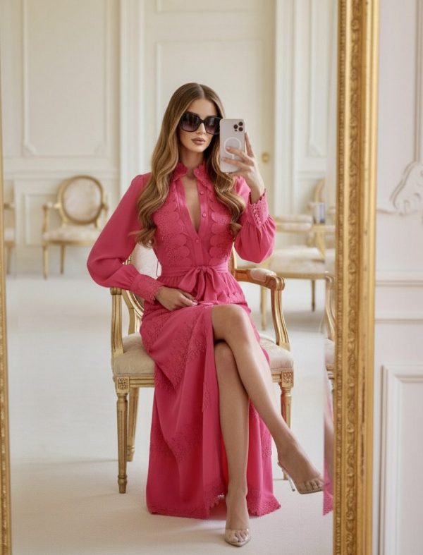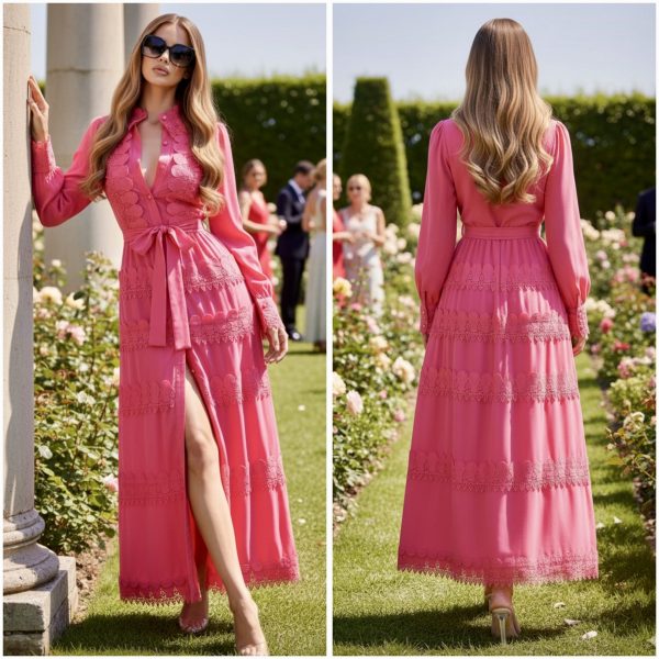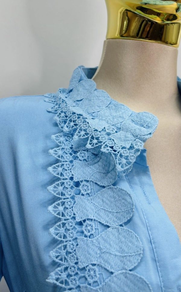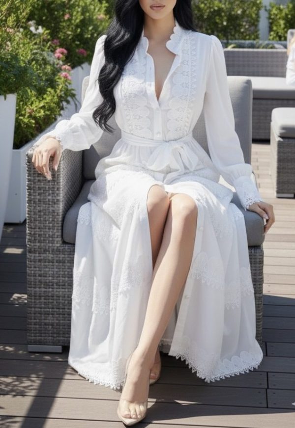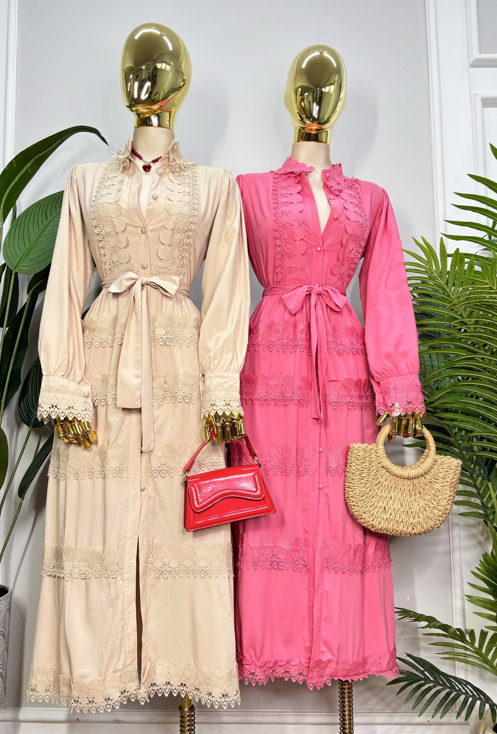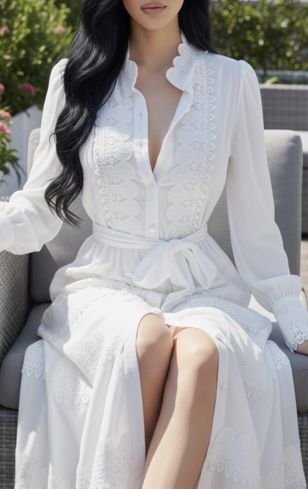 Vestido midi de manga larga confeccionado en algodón ✨. Con detalles de encaje en mangas, cintura y falda que le dan un toque femenino y elegante. Diseño con botones frontales. Incluye forro y cinta para ajustar en cintura y resaltar la figura. Perfecto para ocasiones especiales o un look romántico y sofisticado. 💖