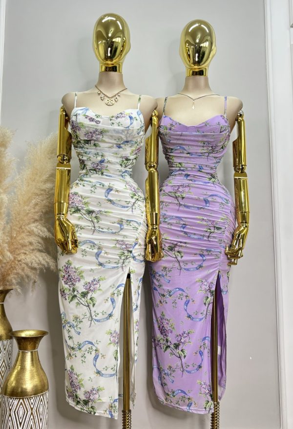 Vestido ajustado con estampado floral sobre un fondo claro. Tirantes delgados y escote estructurado tipo corset con copas que resalta la figura. Diseño ceñido desde el torso hasta la cadera, lo que aporta un efecto estilizado y abertura lateral alta que añade un toque sensual y sofisticado. Tirantes ajustables y cierre invisible en la espalda. El tejido cae con suavidad, ideal para eventos al aire libre o noches elegantes.
