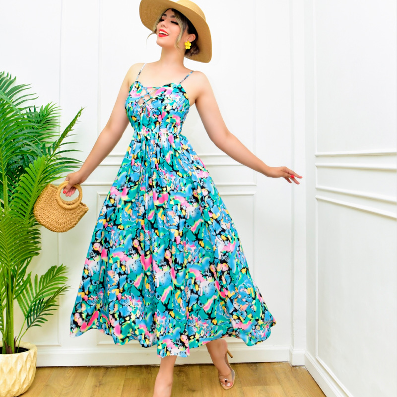 Vestido de tirantes con estampado floral y vivos neón, escote con cintas cruzadas. Bolsillos al costado. Forro en parte superior, elástico en espalda. Cierre invisible.