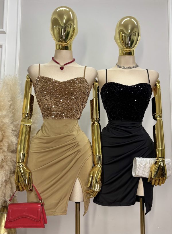Vestido corto con la parte superior cubierta de lentejuelas que aportan un brillo espectacular y un look muy festivo. Tirantes delgados. Falda lisa, con caída suave y un ligero drapeado lateral que estiliza la figura. Ligera abertura en la pierna. Cierre invisible en la parte de la espalda.