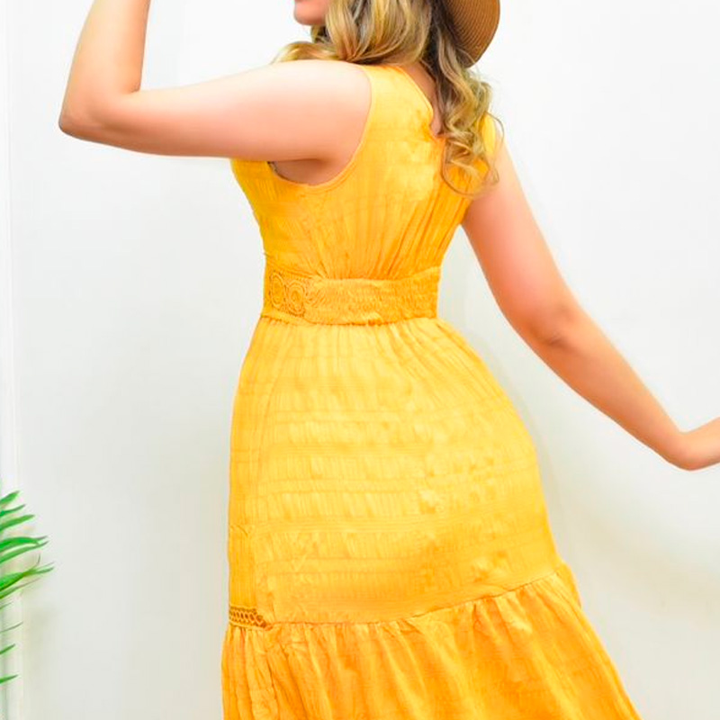 Vestido primaveral con detalles de bordado en falda. Pretina de guipur. Elástico corrugado en espalda.