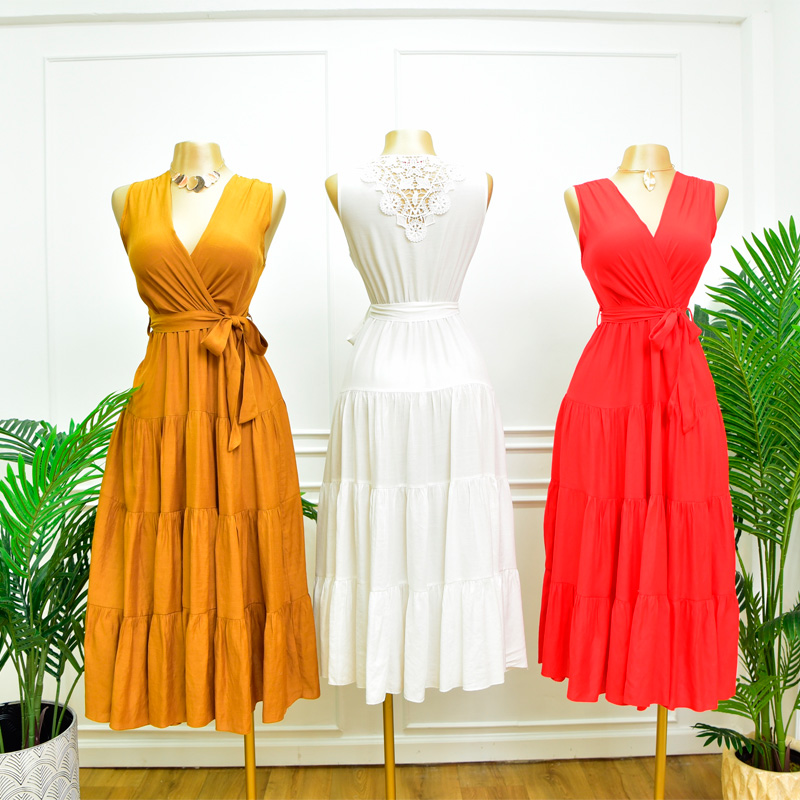 Vestido escote cruzado en V. Espalda con detalle de guipur, falda en capas. Elástico en cintura, incluye cinta en mismo tono. Super fresco, composición de algodón