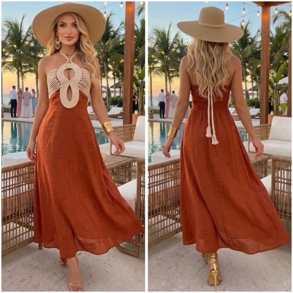 Cuello halter. Corte midi. Caída amplia y fluida. ✨