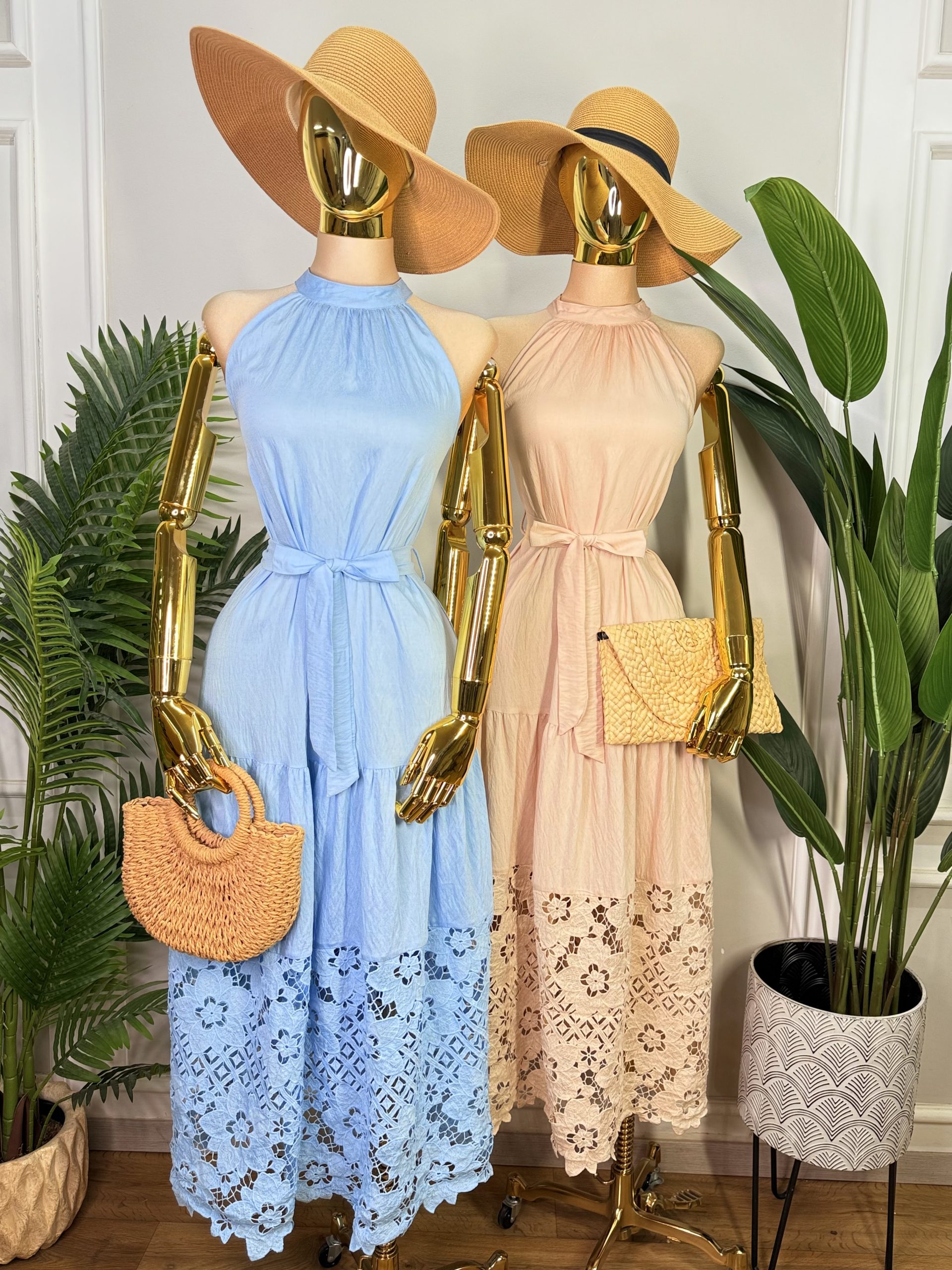 Vestido largo de corte halter y escote cerrado, confeccionado en tela de Viscosa, ideal para climas cálidos. Parte inferior con acabado de encaje floral calado que añade un toque romántico y femenino. Incluye cinturón del mismo material para entallar o cintura. No estira.
