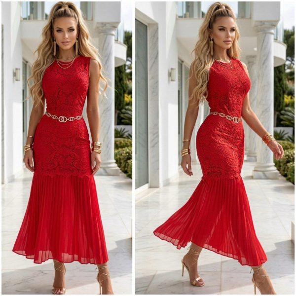 Vestido confeccionado en encaje con diseño floral y bajo plisado. 🥰