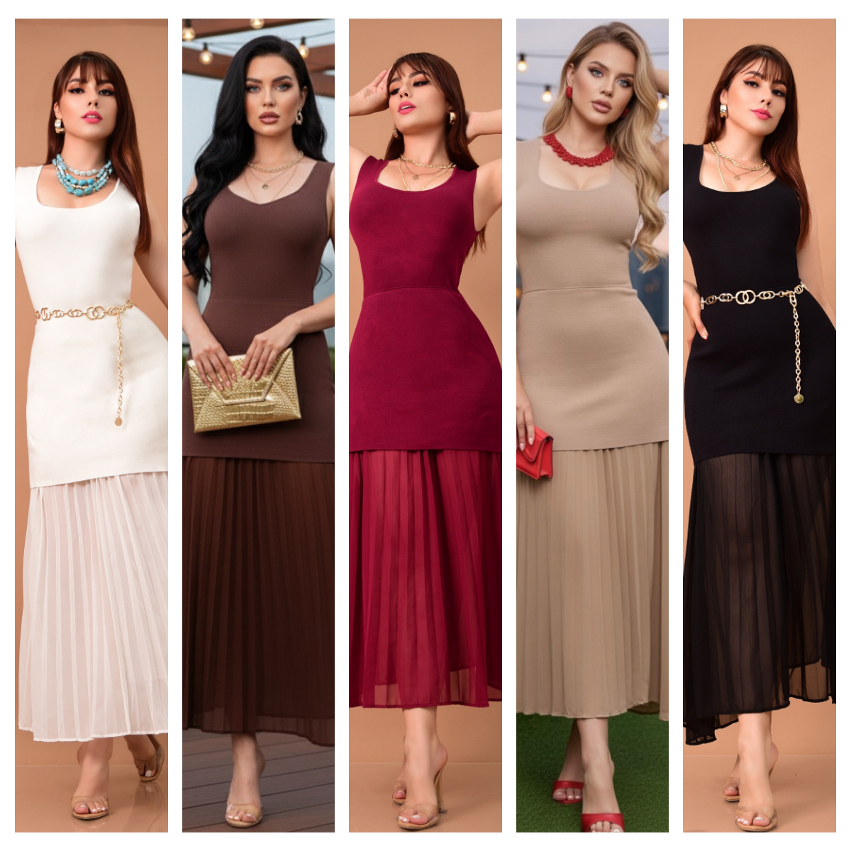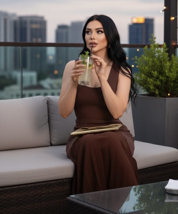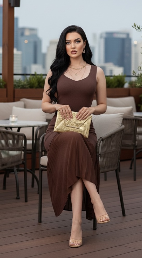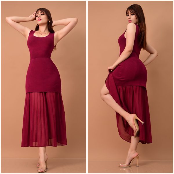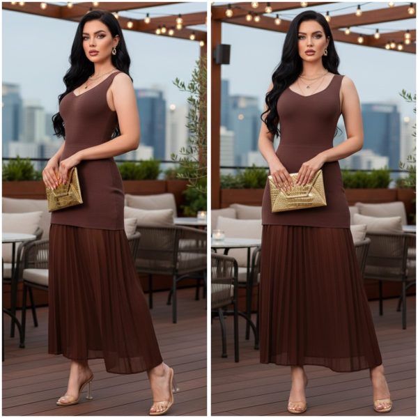 Vestido elegante con diseño ajustado en la parte superior. Confeccionado en viscosa stretch de excelente calidad. ✨ Cuello redondo y tirantes anchos que favorecen la silueta. Falda con acabado plisado que aporta movimiento y sofisticación. 💫