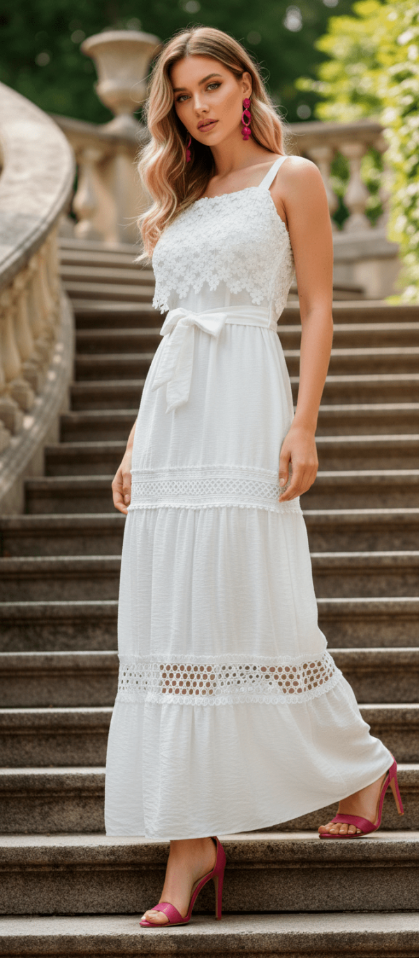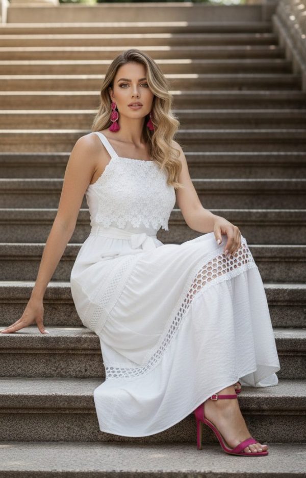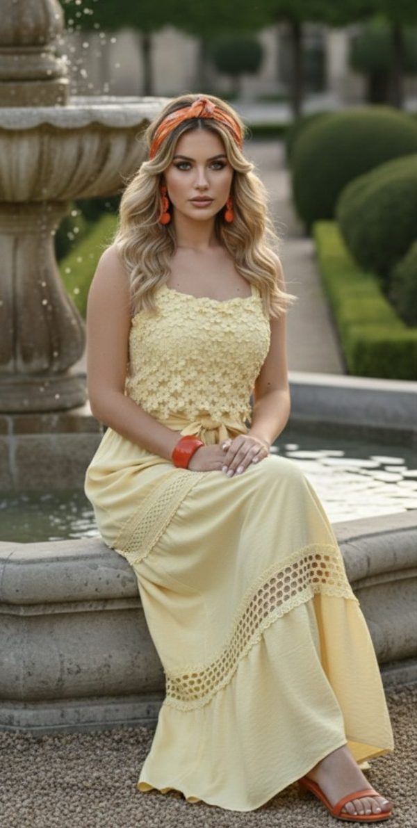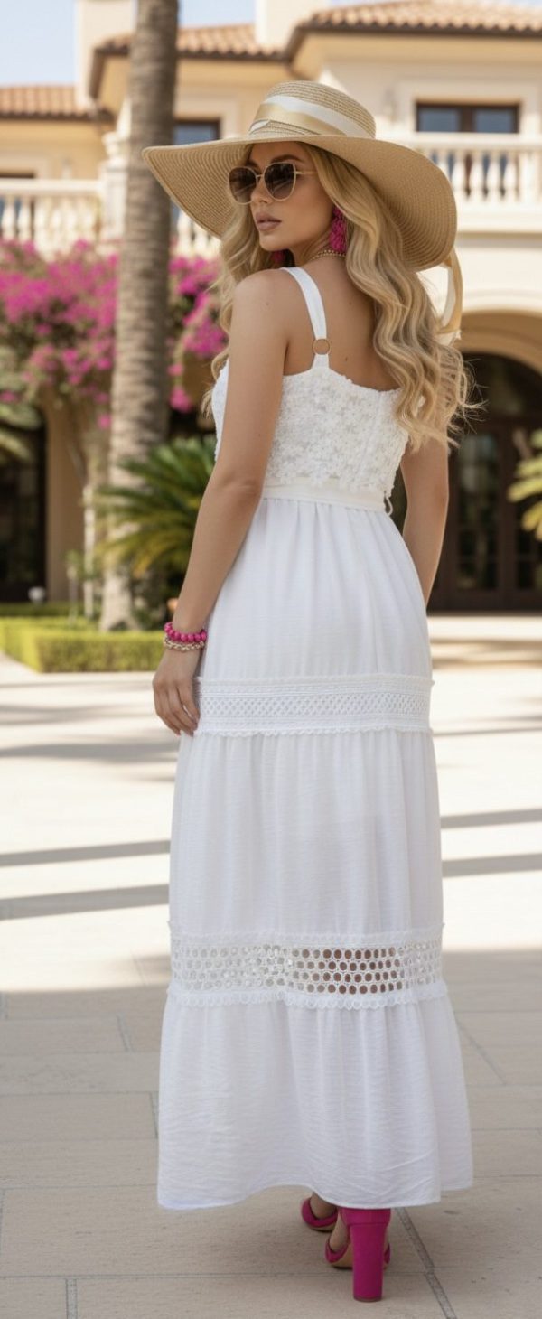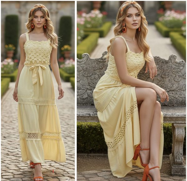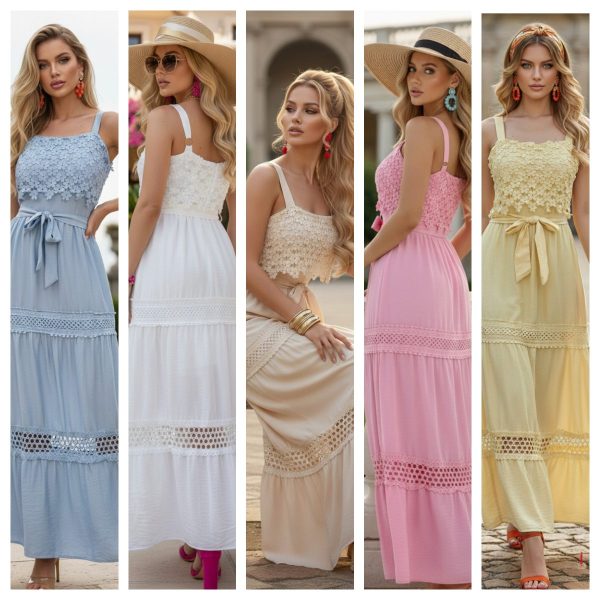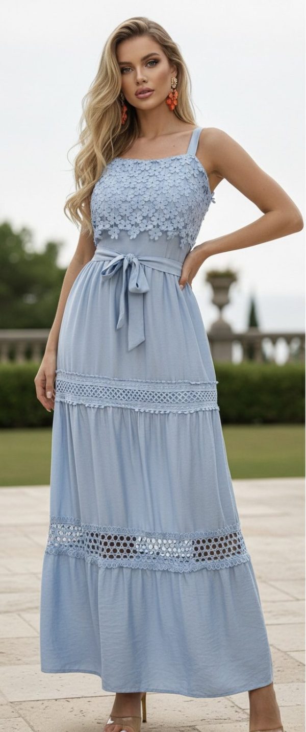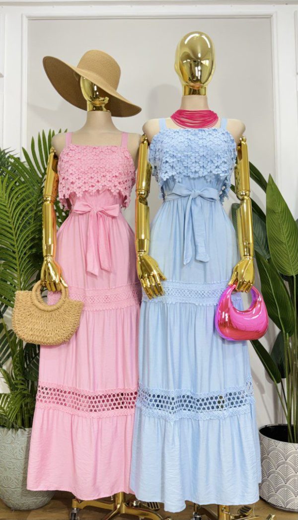 Vestido largo de tirantes. Escote recto con detalle de guipur floral.