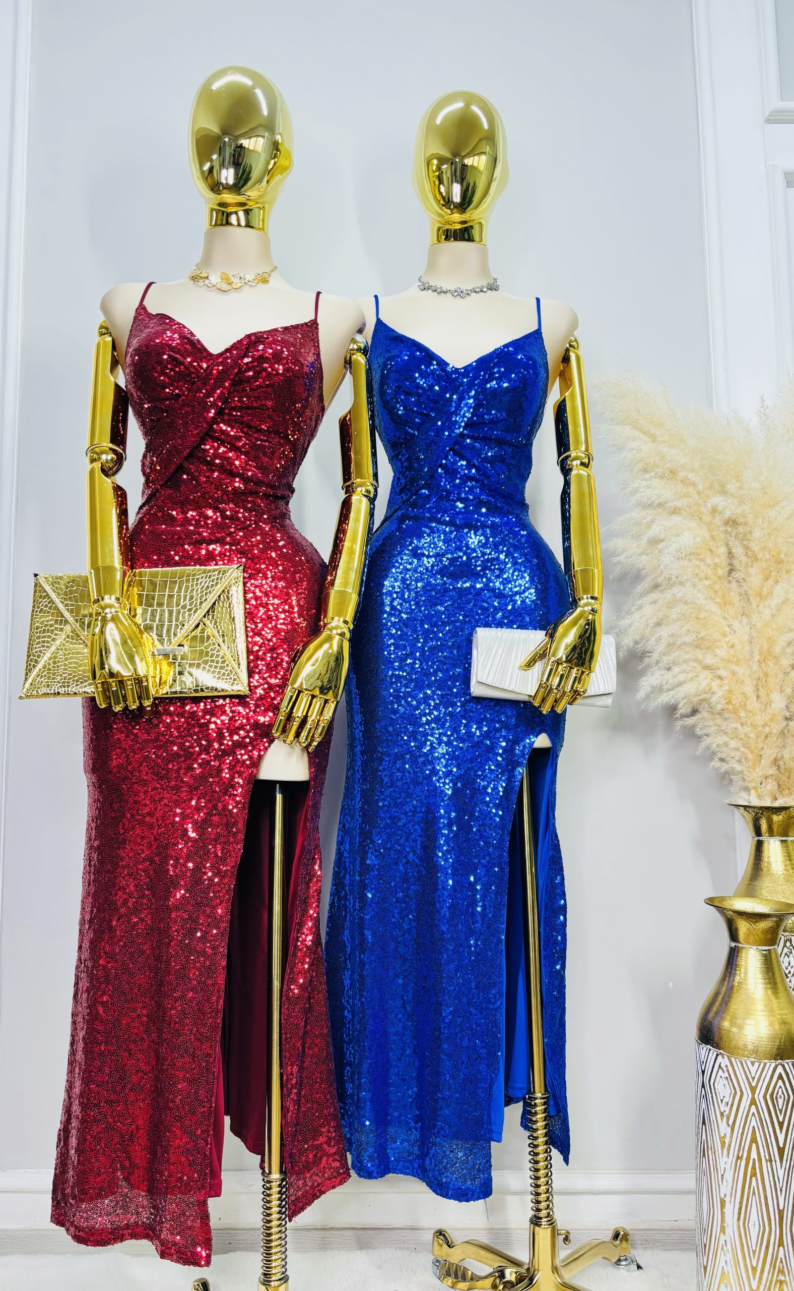 Vestido largo de fiesta con diseño elegante y sofisticado. Confeccionado con lentejuelas con acabado brillante. Tirantes delgados ajustables. Escote en “V”, Detalle cruzado. Incluye copas. Cierre invisible en espalda. Abertura lateral que estiliza la figura y añade un toque sensual. Ideal para ocasiones especiales como cenas, eventos de noche o fiestas formales. ✨✨