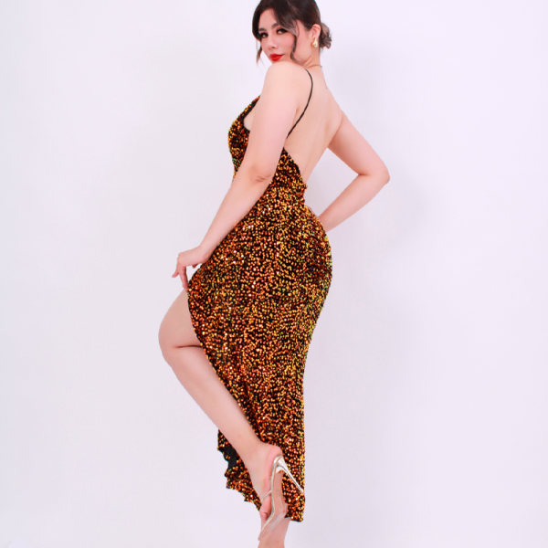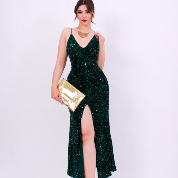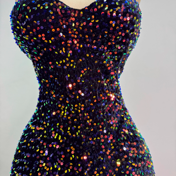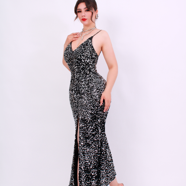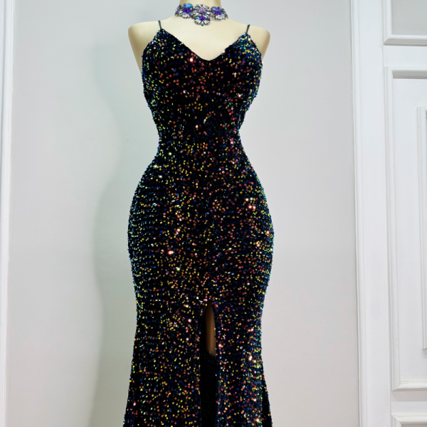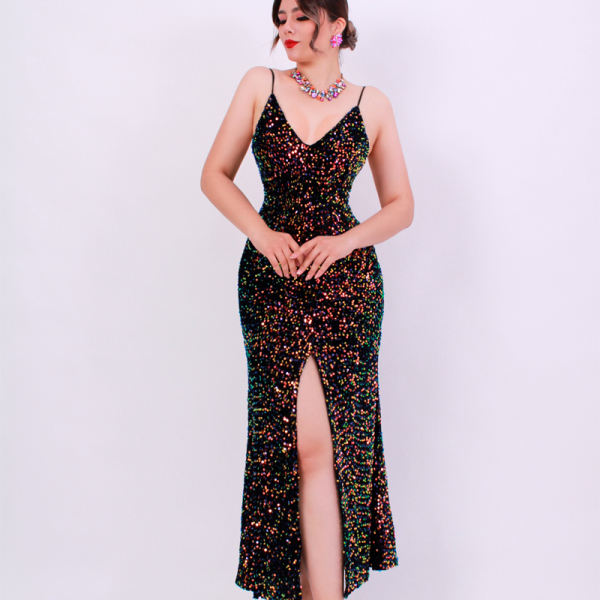 Vestido largo velvet cubierto de lentejuelas, escote en V, escote en espalda. Corte sirena. Copas, cierre invisible en espalda. Tirantes elásticos cola de ratón.