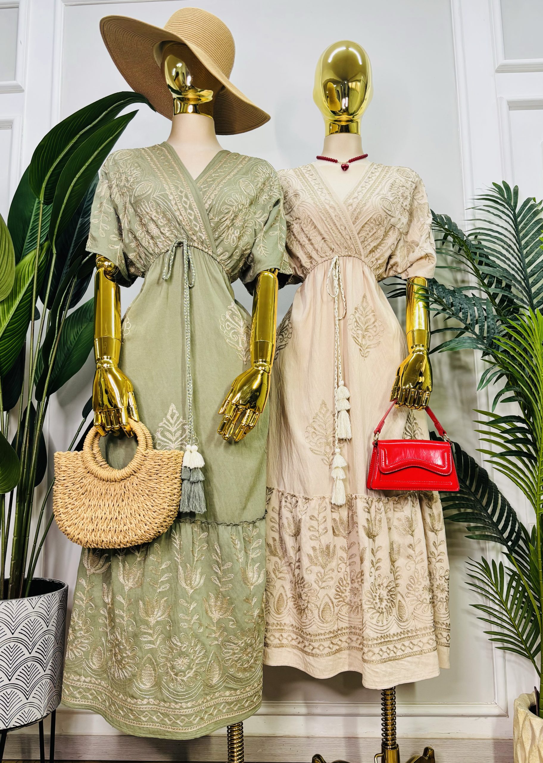 Vestido confeccionado en viscasa freca y ligera de excelente calidad. Diseño con bordado artesanal en tono dorado. Corte favorecedor con escote en “V” cruzado. Mangas cortas amplias y cómodas. Cordón con borlas decorativas. Caída ligera y amplia. Cintura elástica para un ajuste cómodo. Ideal para un look fresco, elegante y femenino 🌸.