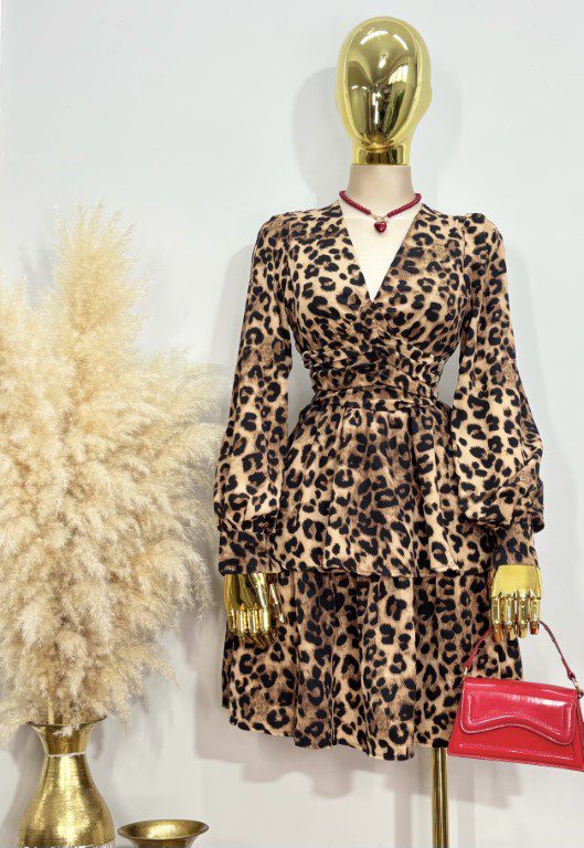 Vestido corte princesa animalprint. Con olanes en capas. Drapeado en cintura. Manga larga tipo farol. Escote en V. Cierre invisible en espalda. Elástico en cintura.